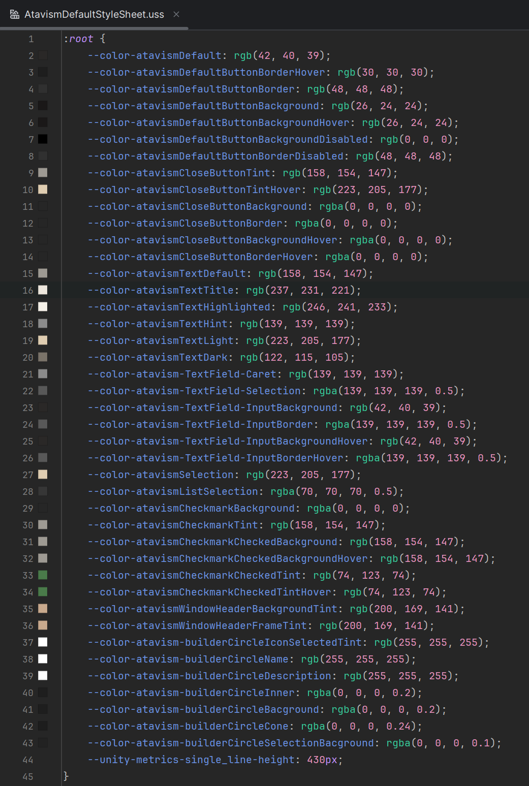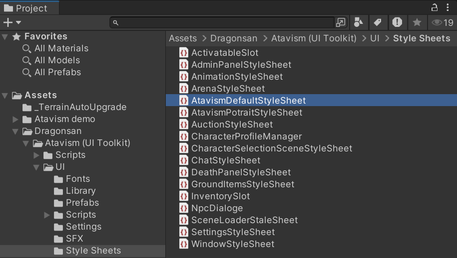 With the new UI Toolkit system implementation you can easily modify any kind of styling. It’s very convenient because it uses USS (CSS subset). The main file AtavismDefaultStyleSheet responsible for styling resides in Assets/Dragonsan/Atavism (UI Toolkit)/UI/Style Sheets.
