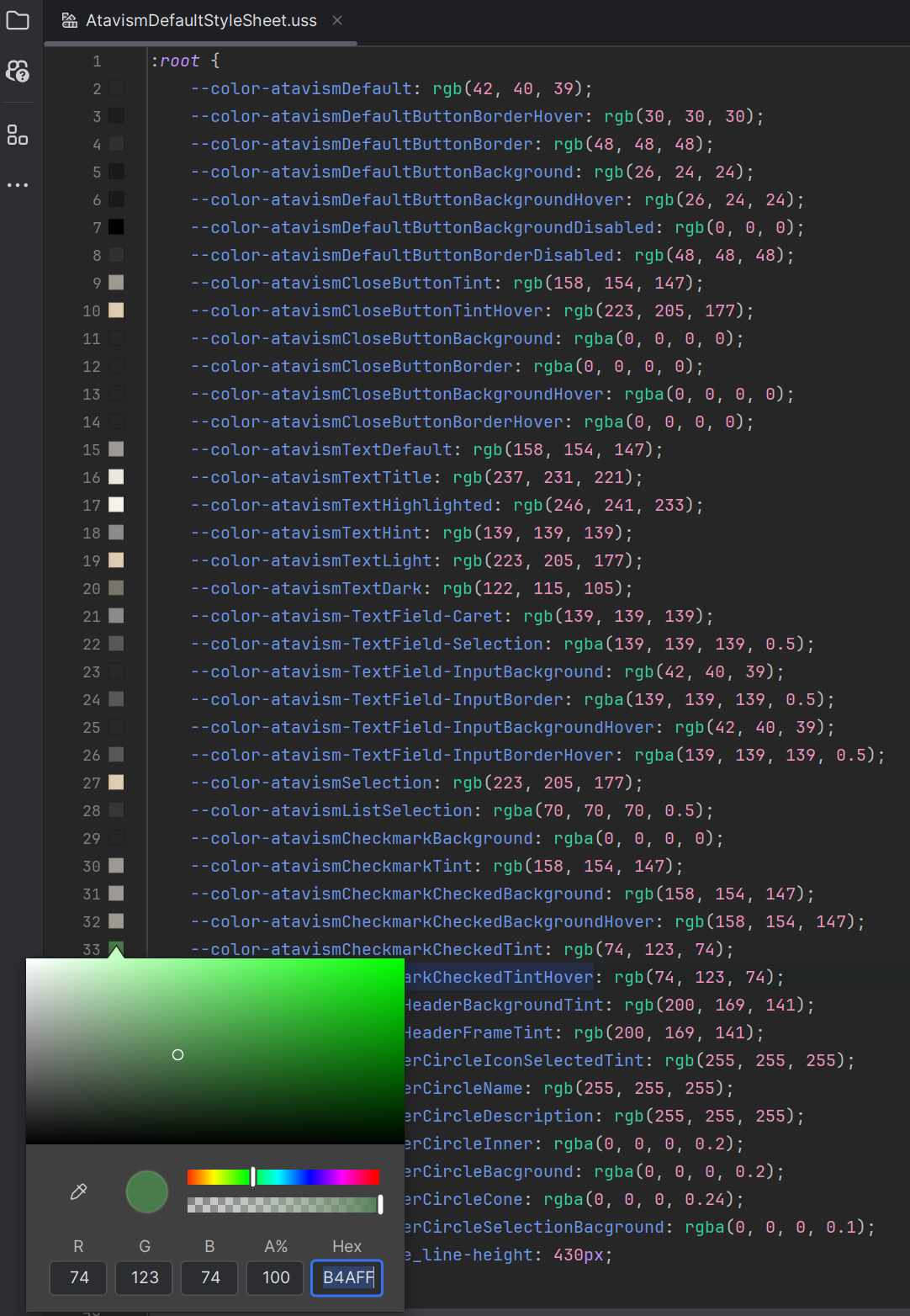 You can modify colors for buttons, checkboxes, texts, etc. Let’s take the checkbox for example. Its color is defined in lines 33 and 34 with green color. You can modify these and all checkboxes will be tinted with the color you will pick. Colors are set as RGB or RGBA. If you are not familiar with this, you can find information on how to get these values using various color pickers like w3schools or Google and then just replace the RGB/RGBA value. In Rider you can simply click on the color icon and pick it directly.