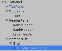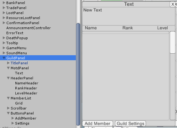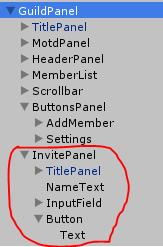 The UI is now set up, so the scene can be saved. One thing that hasn’t been covered yet is hiding the InvitePopup when the GuildPanel first is shown. It would make sense to add:
