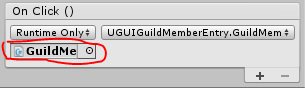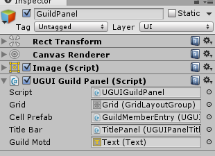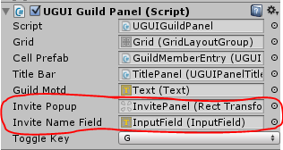 Select the GuildPanel and drag in the InvitePanel into the Invite Popup property box, and the InputField into the Invite Name Field. Finally, add an OnClick event to the AddMember button (in the ButtonsPanel) and drag in the GuildPanel. Set the function to UGUIGuildPanel.AddMemberClicked.