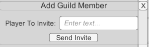 The next step is to create the invitePanel. Create a new UI Panel as a child of the GuildPanel object, resize/position as desired, and add the TitlePanel prefab (from AtavismObjects/Scripts/UGUI/UI Prefabs). Change the text on the Text child to something like “Add Guild Member”. Add a Text object, an InputField and a Button to the InvitePanel. Set the text on the Text object to something like “Player To Invite:” and set the text on the Text child of the Button to say “Send Invite”. Add an OnClick event to the Button and drag in the Guild Panel, then set the function to UGUIGuildPanel.AddMemberByNameClicked.