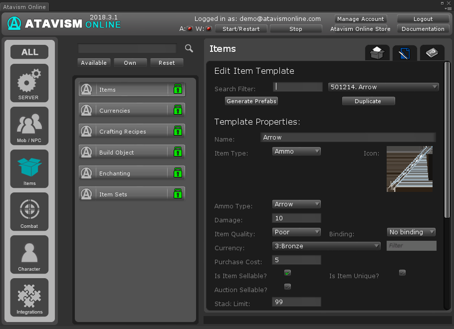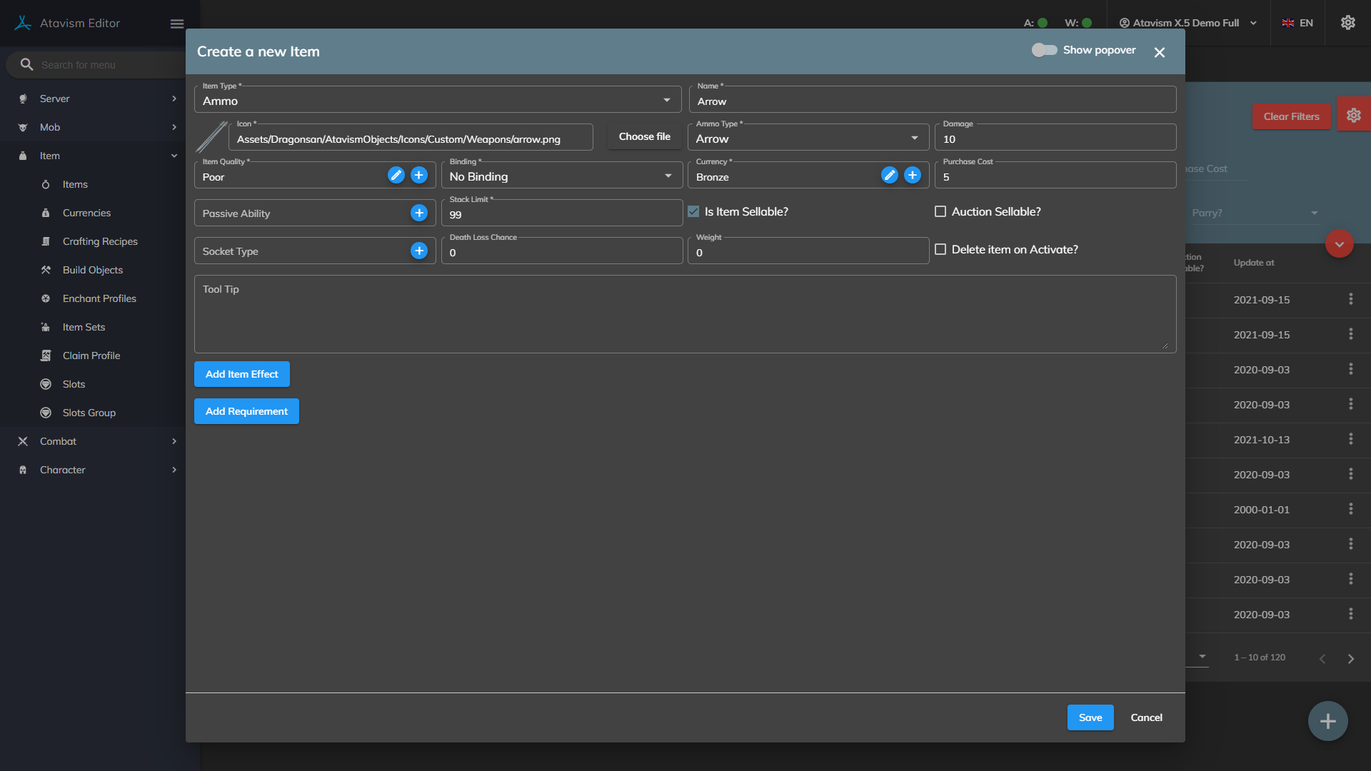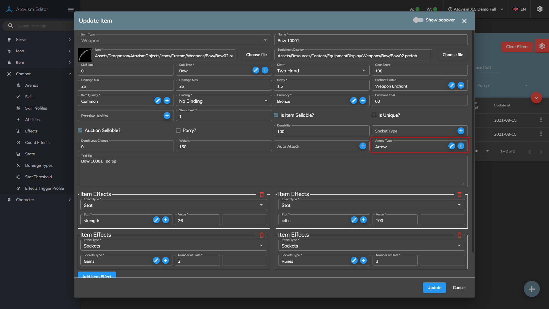 4. Create an item with an ammo type: Arrow