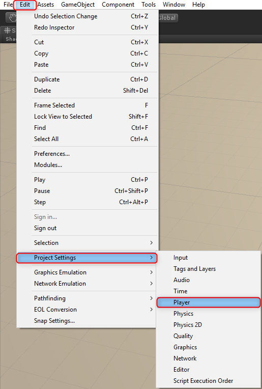 2. Set Color space to Linear, of course, it’s an optional step, but if you want to make our demo looks properly you should set it. In order to do that just click Edit in the top menu section and then Project Settings and Player.