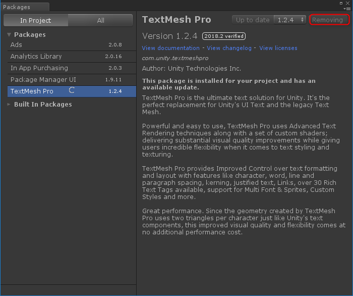 1. If you are going to use Unity 2018.x or 2019.x with Atavism 2018.x then you will have to remove TextMesh Pro integrated by default with Unity 2018.2, by heading into Window->Package Manager, select TextMesh Pro and click Remove button in the right corner. It’s because Unity recompiled DLL file and you would lose all your references to TextMesh Pro in the canvases.