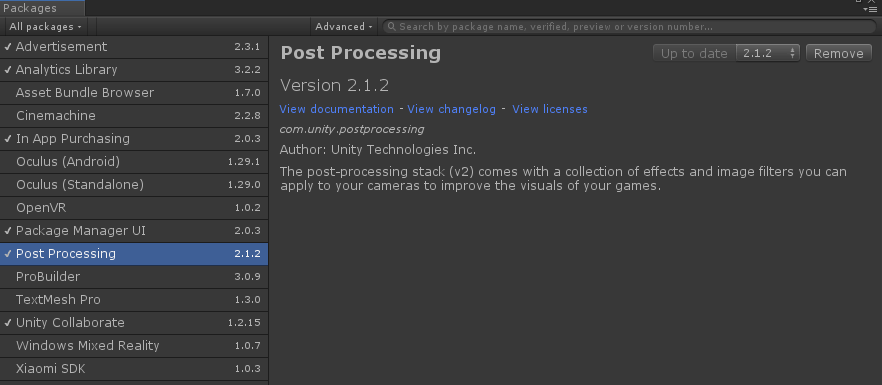 Step 4: Optionally you can import Postprocessing Stack from the Window -> Package Manager