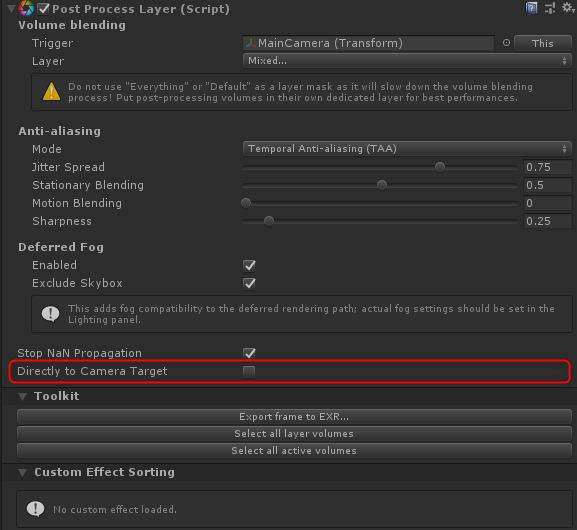 Important note: If you are using Unity 2019.1.x with postprocessing stack, you have to disable “Directly to Camera Target” option on the MainCamera in the following scenes: MainWorld, Arena1v1, Arena2v2, Deathmatch 1v1, Deathmatch 2v2, SinglePlayerPrivate, GuildPrivate, BlankAtavismScene, like on the screenshot below.