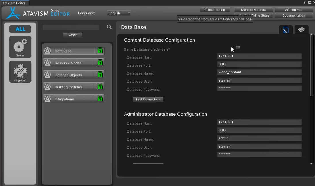 Step 8: Click Reload config to load the same database credentials as you defined in the Atavism Standalone Editor
