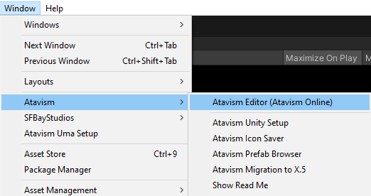 Step 7: In the Unity Editor, in your project, open Atavism Editor by clicking Window -> Ataivsm -> Atavism Editor (Atavism Online)