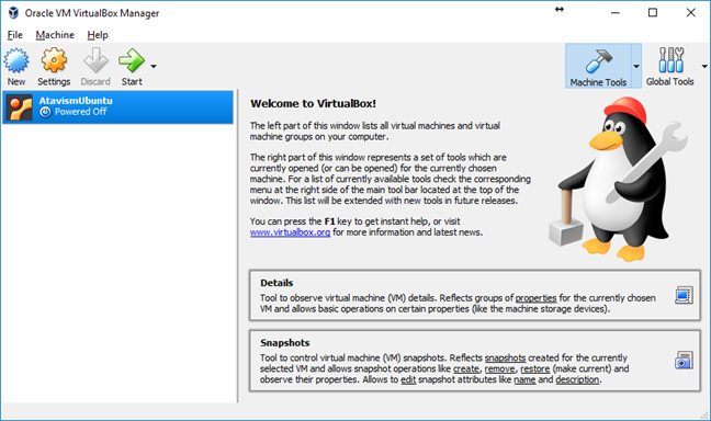 You can modify the Settings of this VM (especially the network card) by clicking on the Settings button: