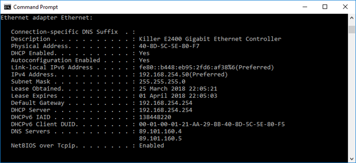 In Windows OS open CMD and enter the command ipconfig /all and press enter – this will show something similes to this: