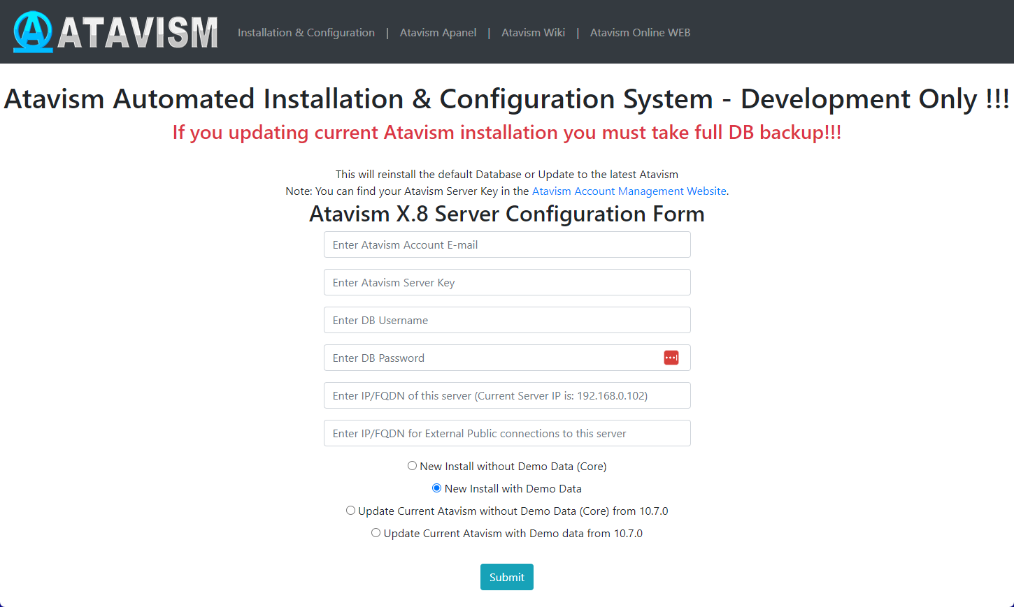 Install Type: Select Installation Type, for new users we recommend to make New Install with Demo Data, which will give you many examples of how to configure specific elements of Atavism.