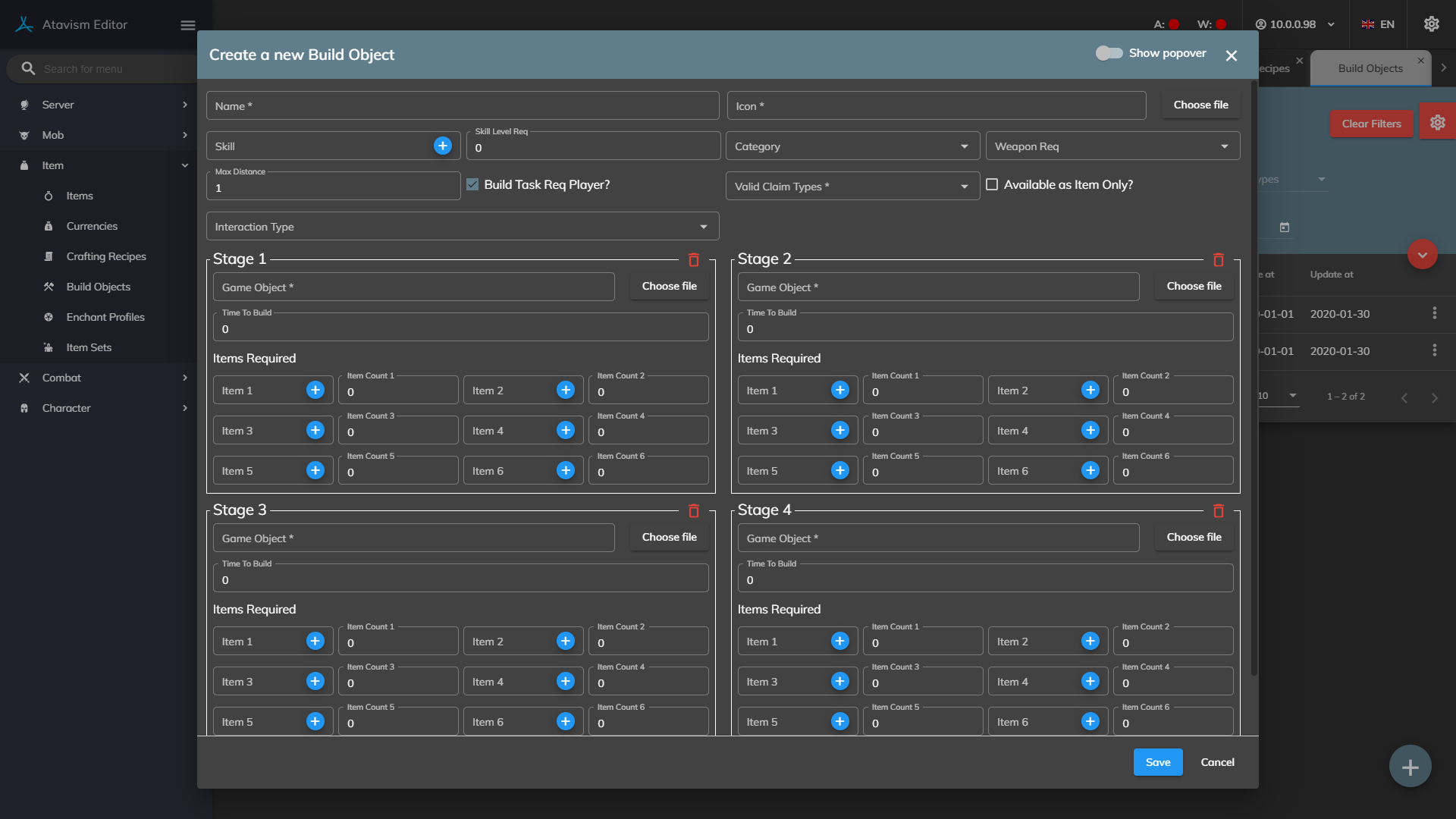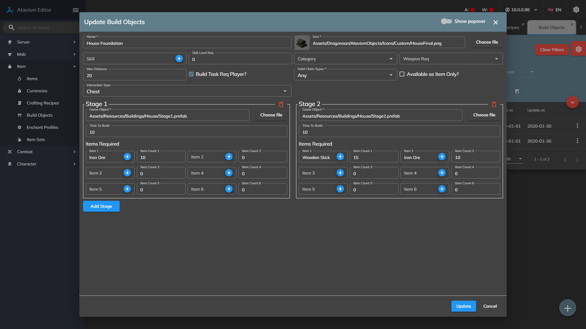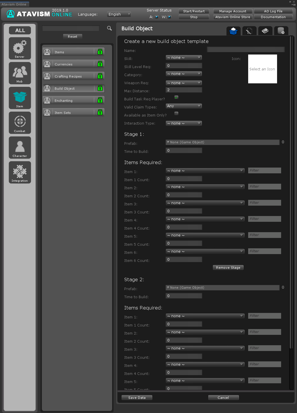 Once the prefab has been made, go into the Build Object Plugin in the Atavism Editor and create a new template. Set the name and other requirements as needed, then drag the prefab into the Stage 1 Prefab slot along with setting the Items needed to be able to build this object.