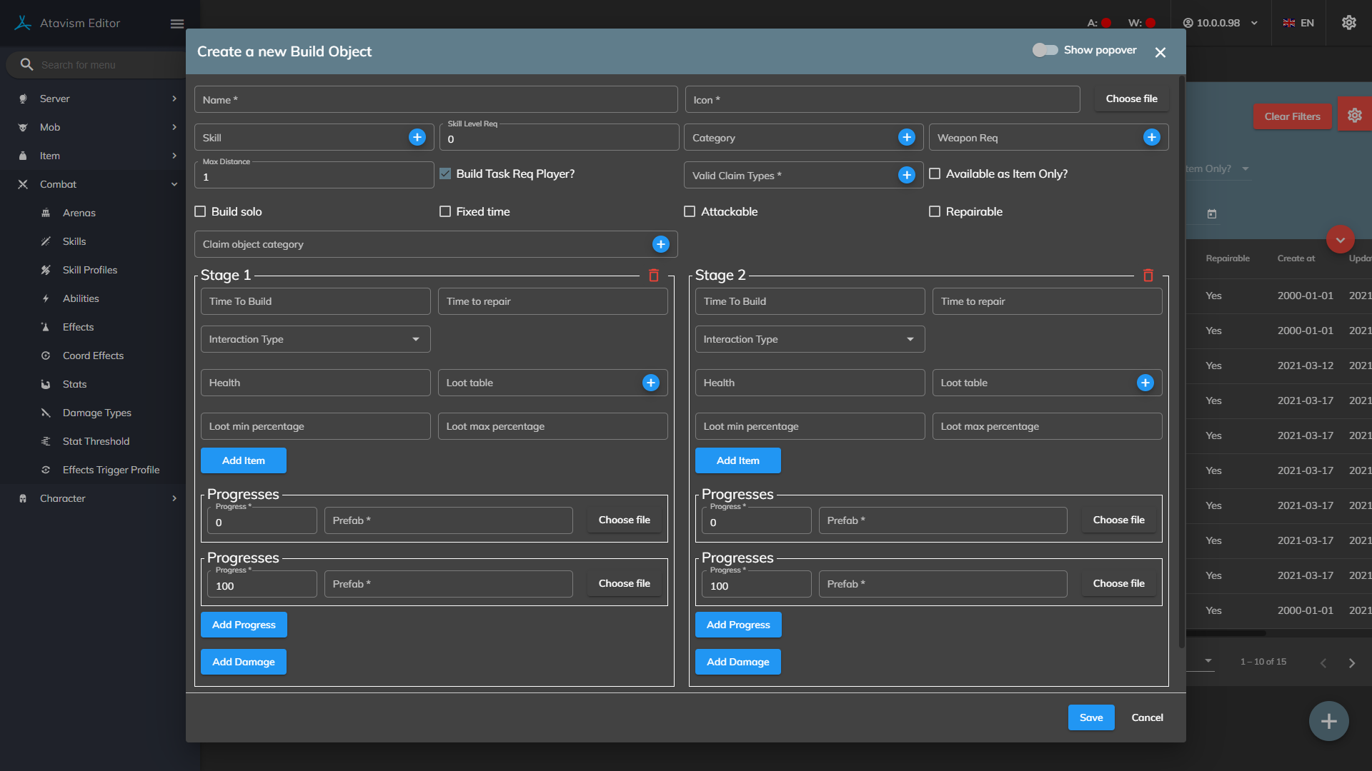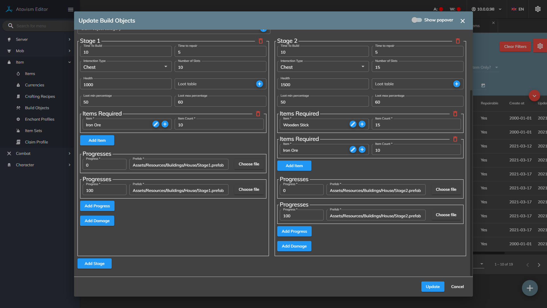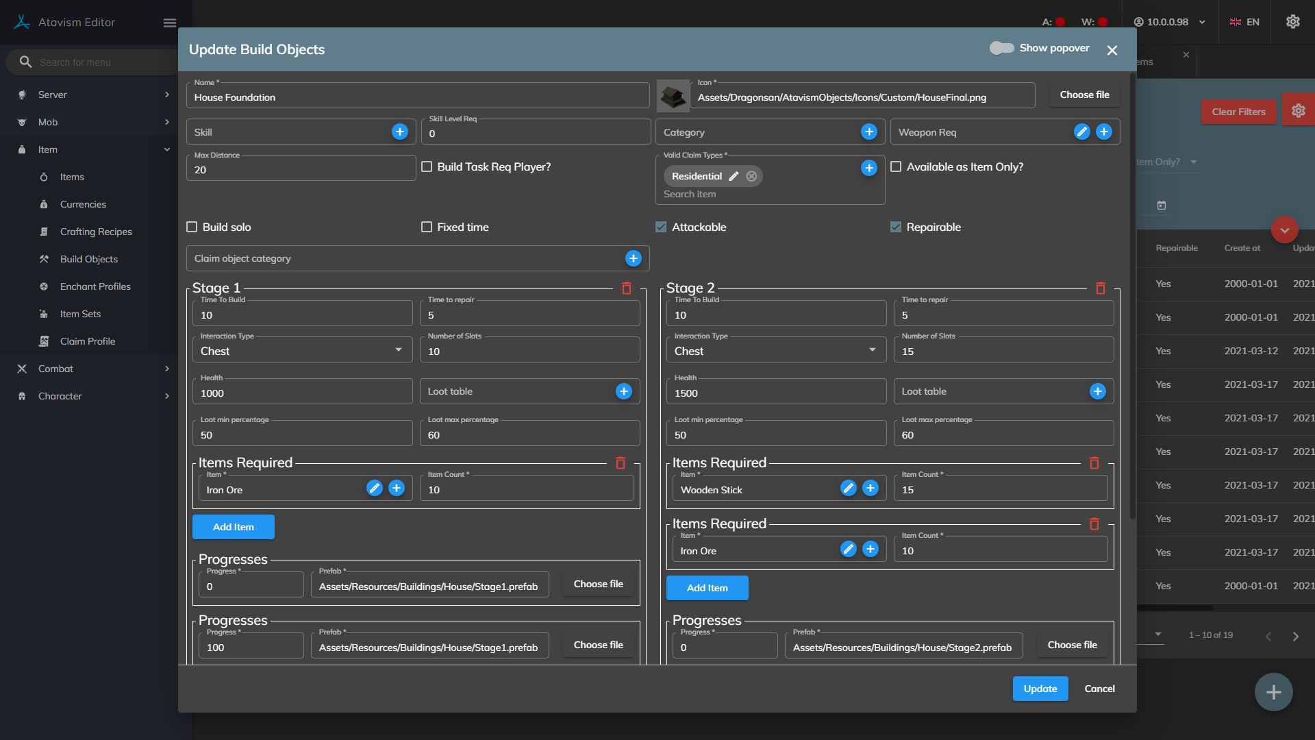Once the prefab has been made, go into the Build Object Plugin in the Atavism Editor and create a new template. Set the name and other requirements as needed, then drag the prefab into the Stage 1 Prefab slot along with setting the Items needed to be able to build this object.