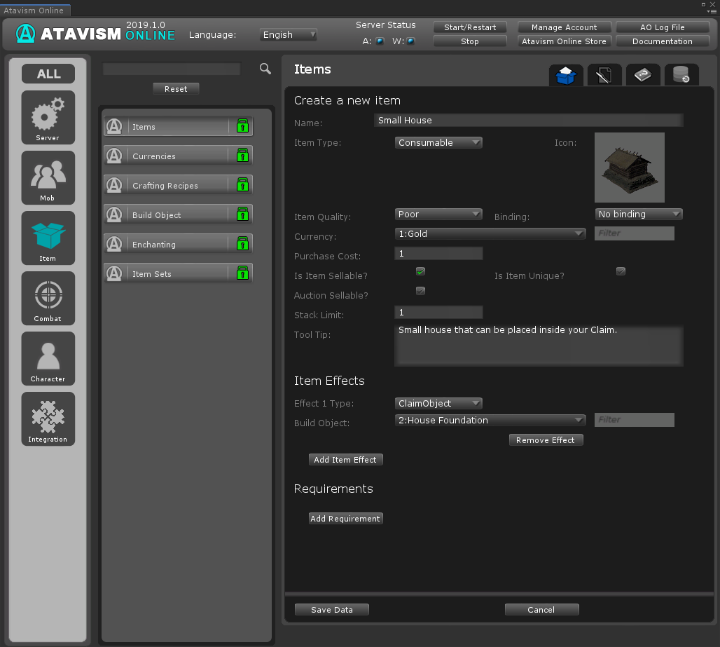 - Items Required allows you to set up to 6 different materials required to construct this build object.