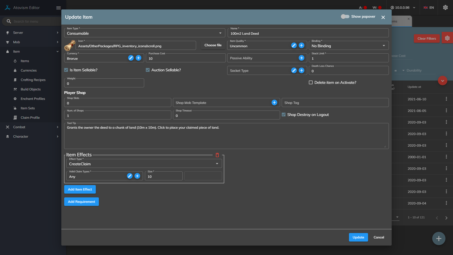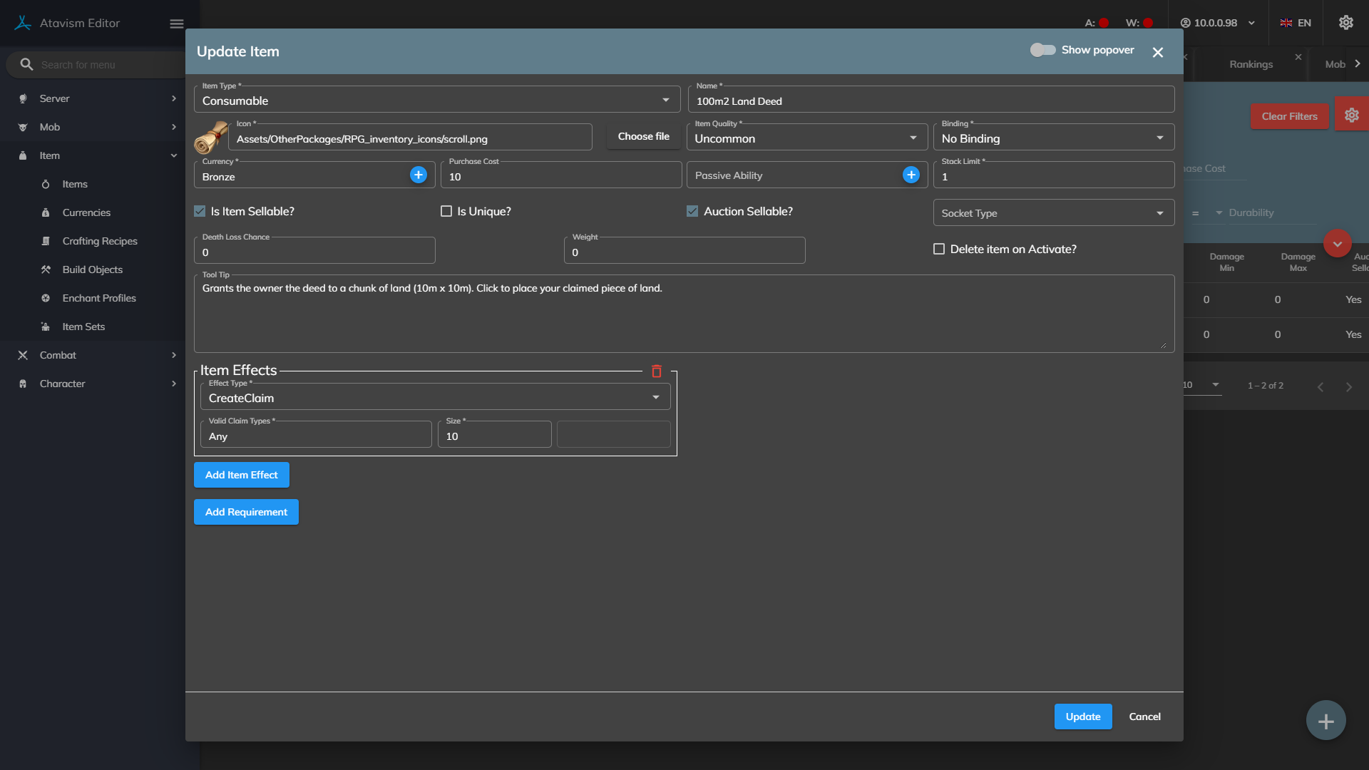 - Items with a ‘CreateClaim‘ effect can be used. Make sure the size field is filled in. It is in meters.