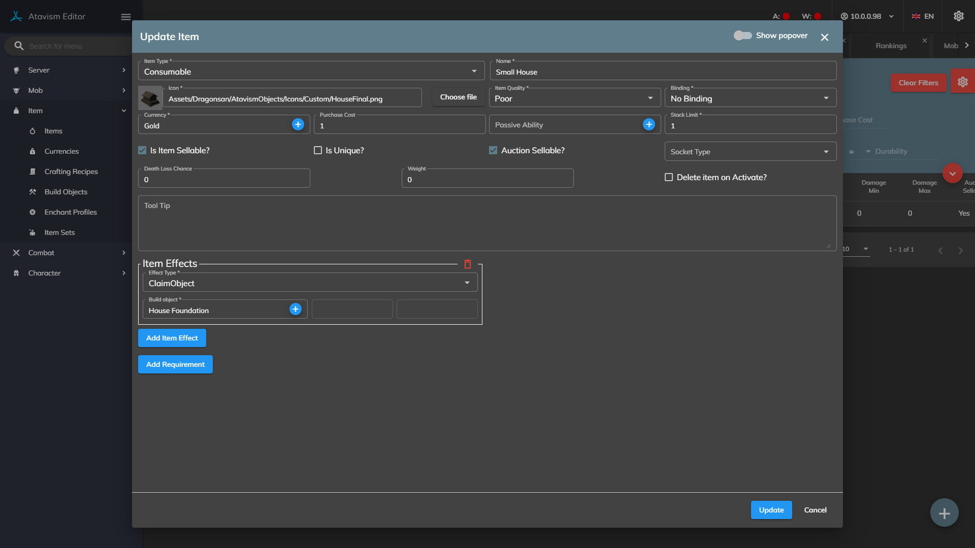 Available as Item Only?: Defines if this building should be available only as an item or also in the building list