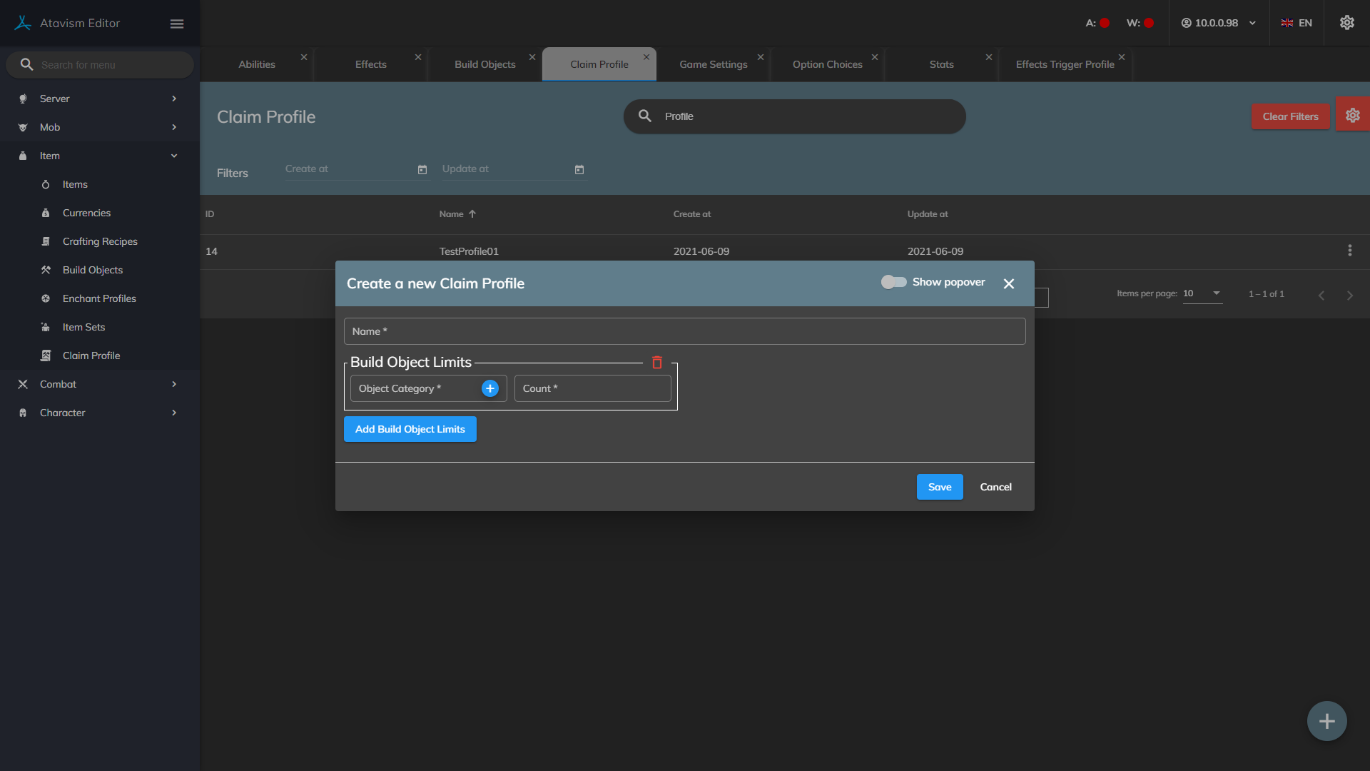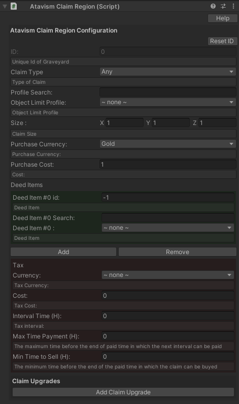 - Or using the Atavism Claim Region component. Using this method is the most convenient because as an admin you can define claim placement, tax, Object LImit Profile that defines the number of buildings within building category possible to build in the claim, Claim Type but also it’s possible to define Claim upgrade, so at the start the claim can be 10×10 meters, and then 20×10 at level 2, 25×15 at level 3, etc. You can also define upgrade costs using items and currency.