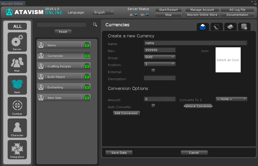 Currencies are used to buy, sell, and trade items, along with paying for other services. Numerous different currencies can be created and used in a game with different items being able to use different currencies for buying and selling. Currencies can easily set up in the Atavism Editor window and then set as a property on items and on other objects.