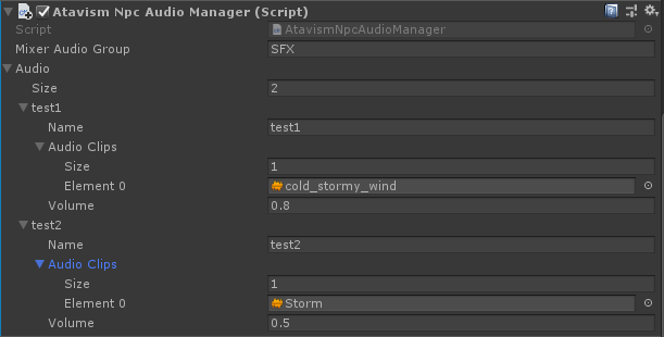 In this example, test1 is the audio clip group name that can be set as the Audio clip field in the Ataivsm Editor. There you can attach audio clips, and if there will be more than one per group it will be randomized. You can also define the volume of the audio if necessary.