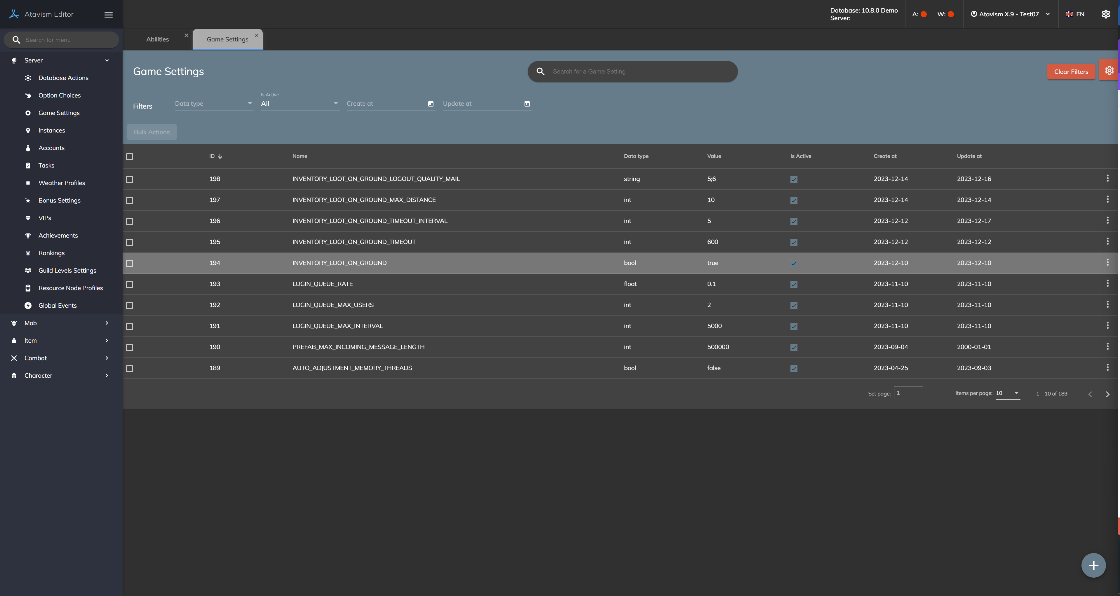 To set up dropping items on the ground we have to set the INVENTORY_LOOT_ON_GROUND game setting parameter to true in the Atavism Standalone Editor -> Game Settings option.