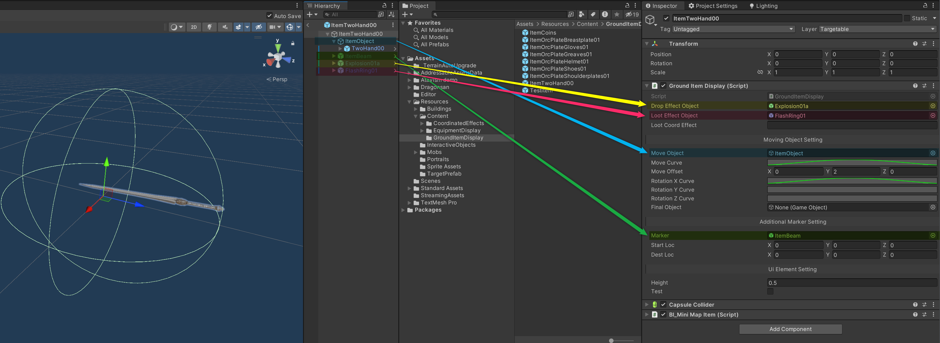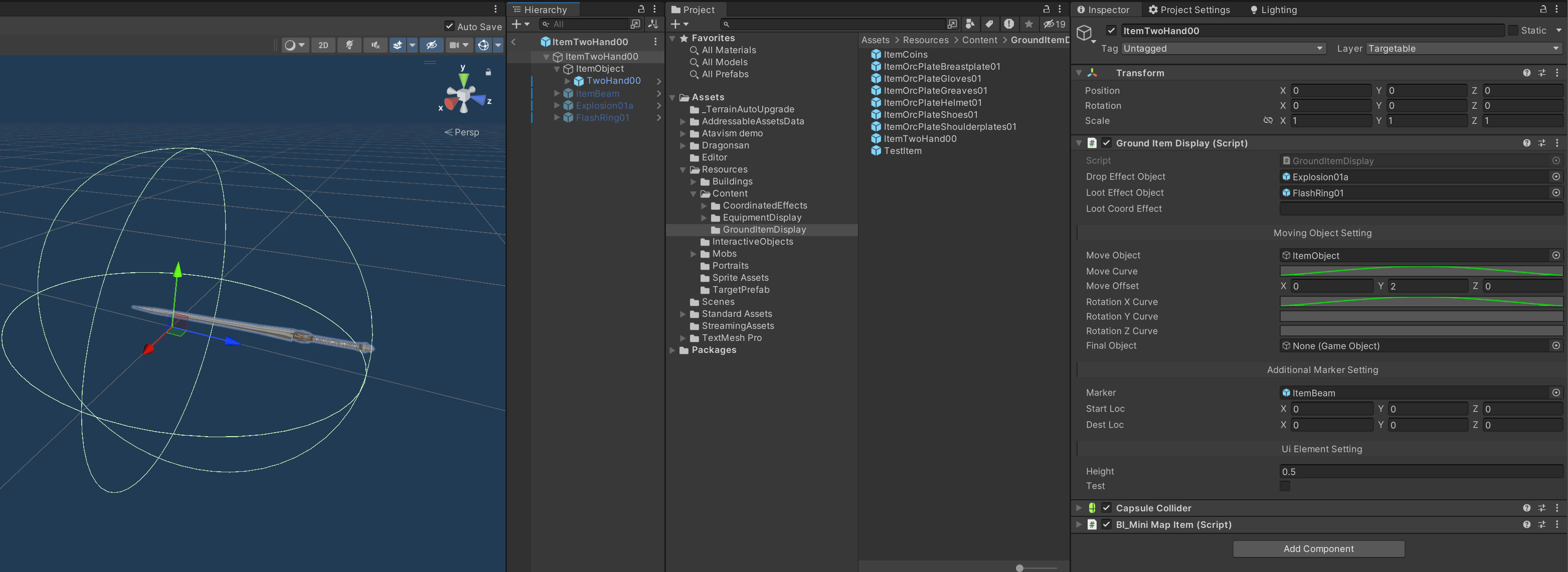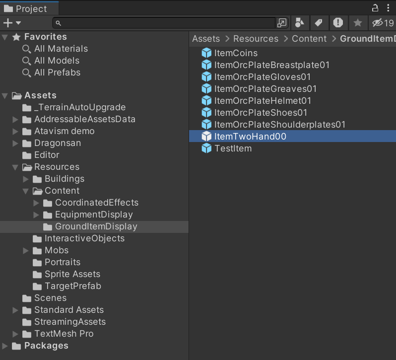 Now we need to define the visual representation of the dropped item. To do this, we need to create a prefab in the Unity Editor, but for this document purpose we will use a reference example included in the Atavism called ItemTwoHand00 located in the Assets\Resources\Content\GroundItemDisplay