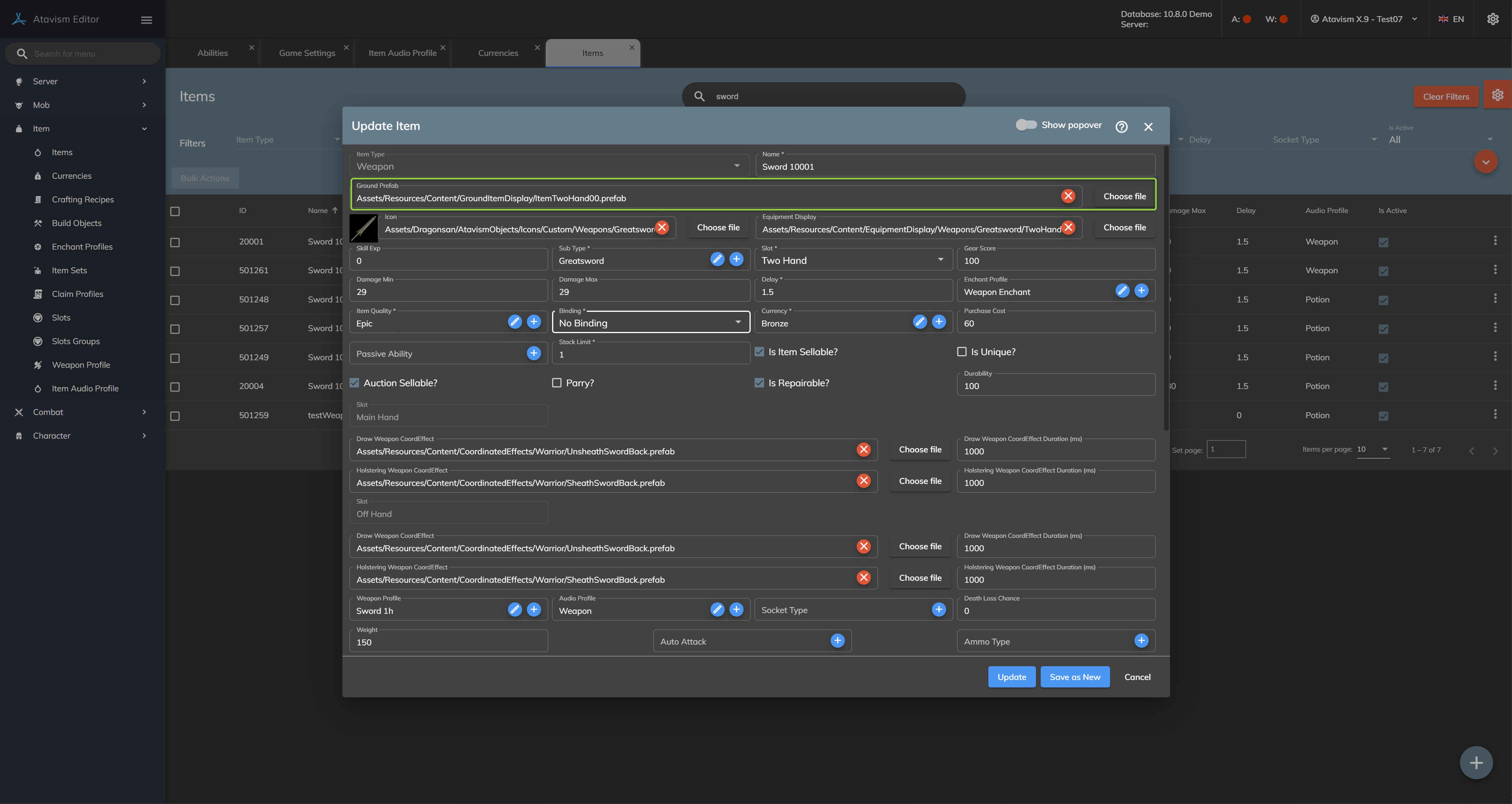 You can also set some audio effects, that can be within objects that Atavism will turn on or off within the Item Prefab, or you can use the new Audio Evnet System for Items and this is configured in the Atavism Standalone Editor. There you have various events that you can set, but these are described more here.