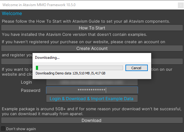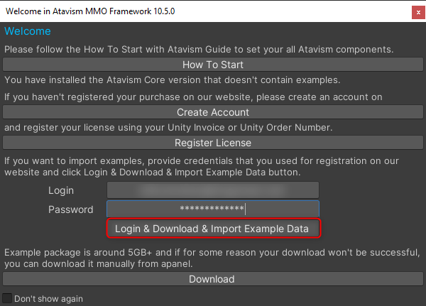 - Provide your Atavism credentials Login and Password, and click Login & Download & Import Example Data button