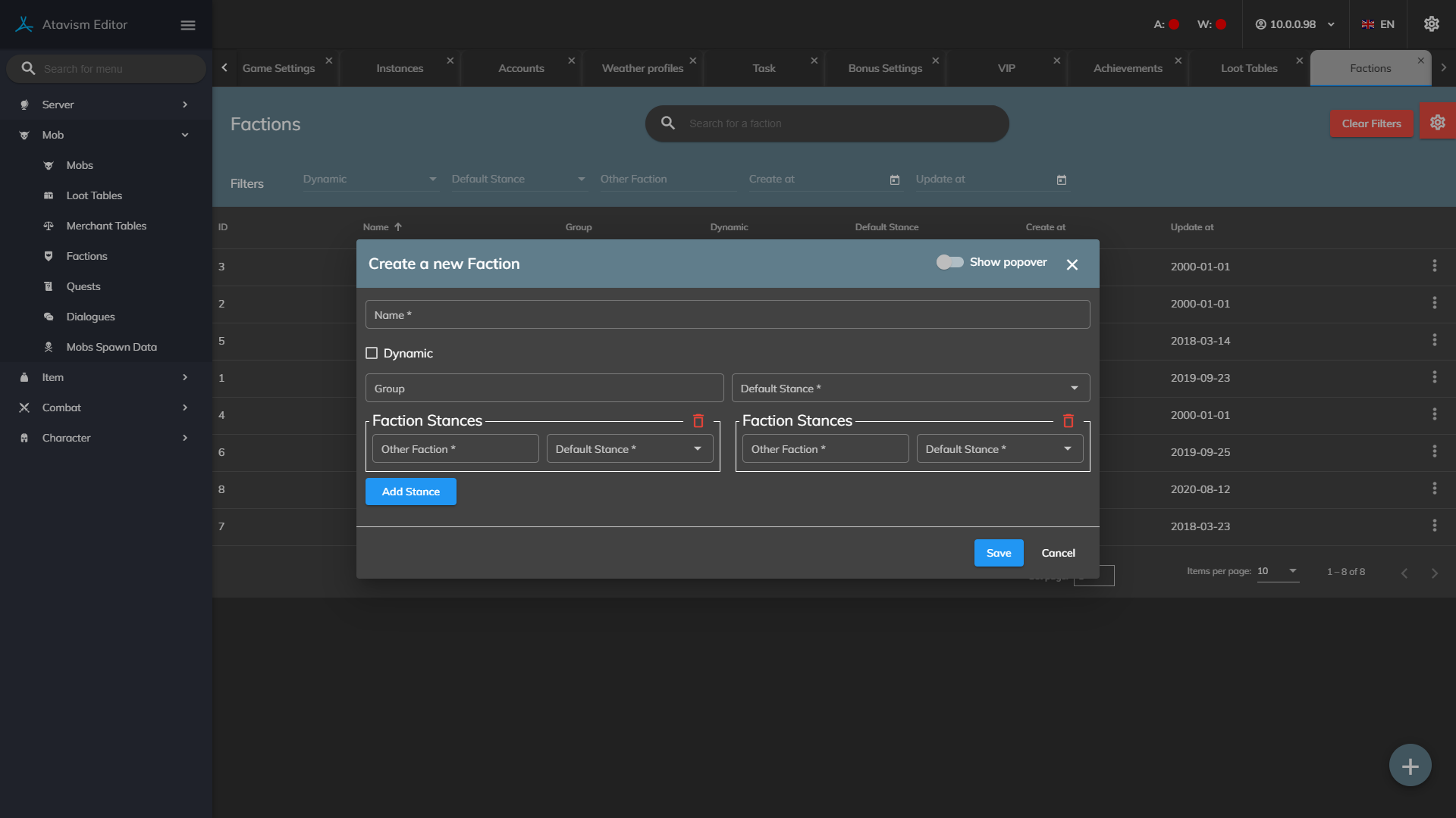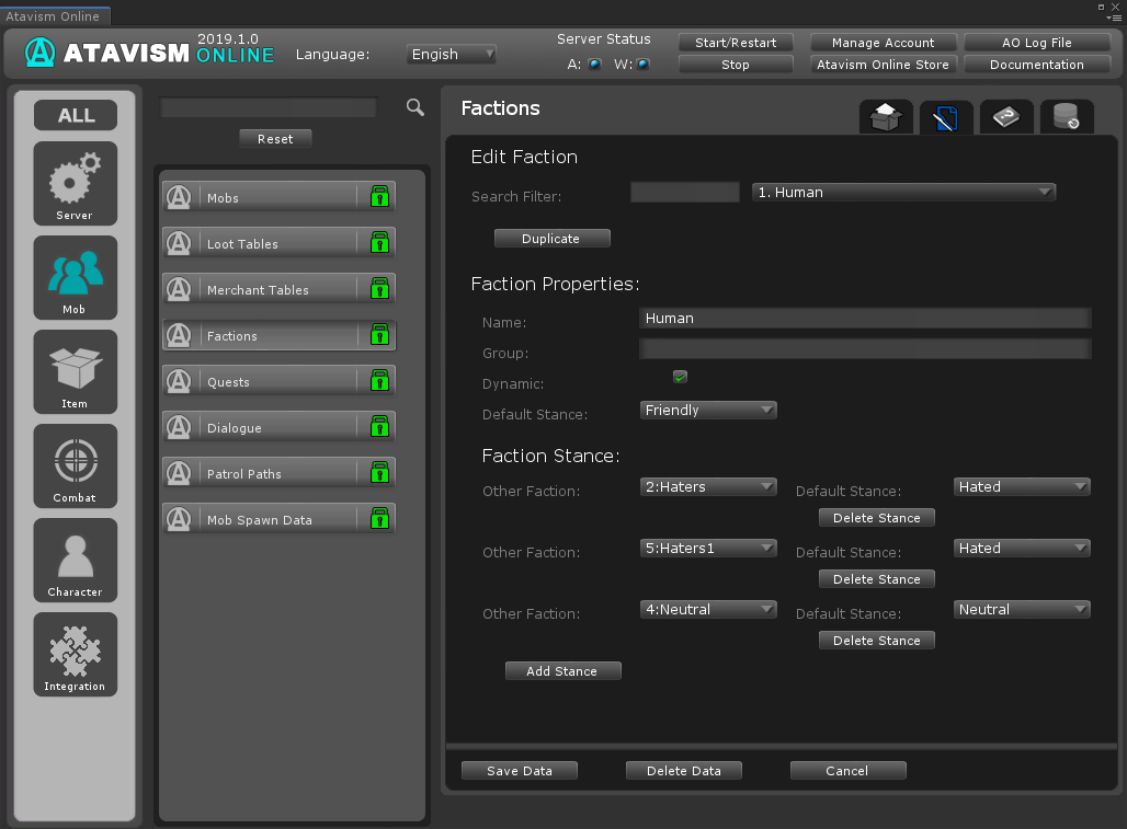 Factions are used to determine how mobs and players interact with each other. Each faction has a base stance towards other factions (such as Hated, Neutral, Friendly) and can have additional stances for specific factions.