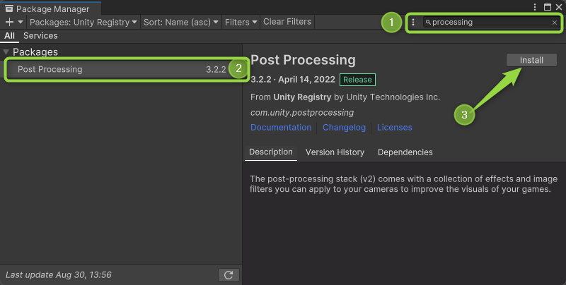 Type the processing word in the search field, select the Post Processing package on the list, and click the Install button.