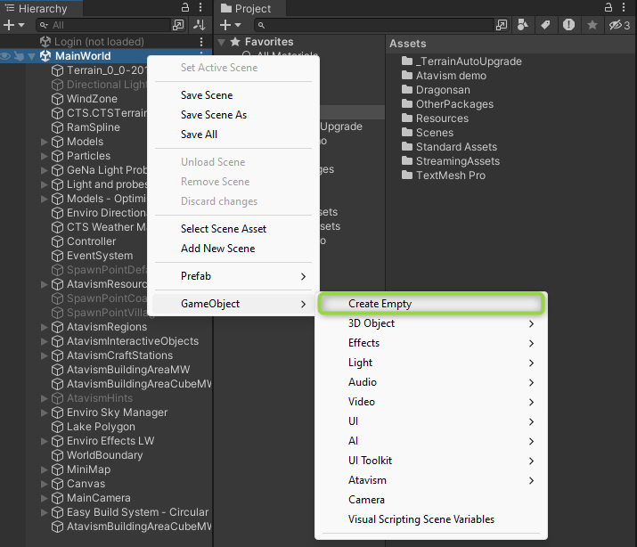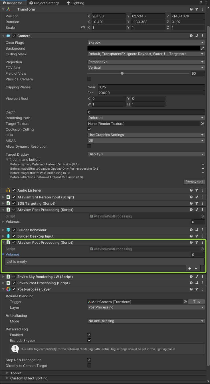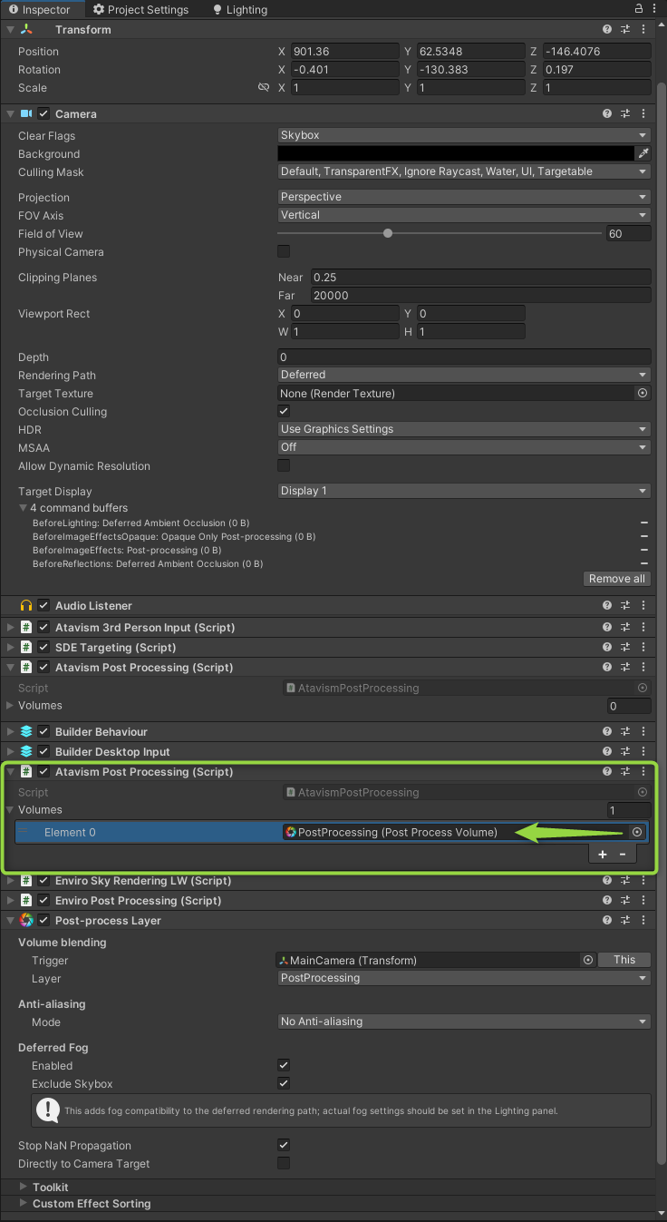 Then all you have to do is find the Atavism Post Processing component on your MainCamera, expand the Volume list, add one entry, and drag and drop the PostProcessing game object that we created in the scene.