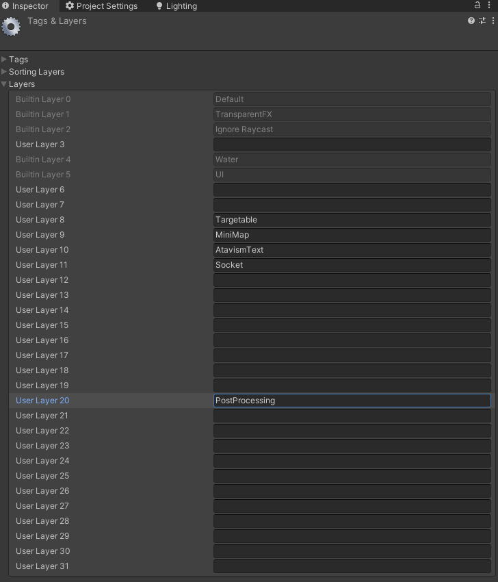 Then Provide the name of your choice in any free layer you want. In our case, it will be Layer 20 with the name PostProcessing, like this