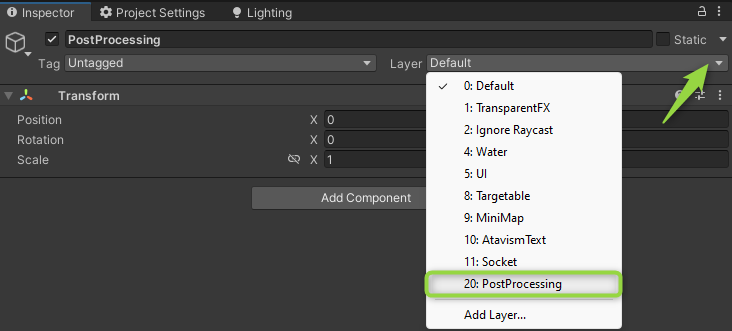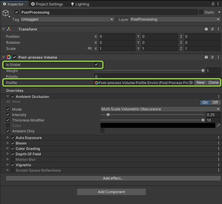 In the component settings, you can create your own Postprocessing profile or if you are using Ataivsm Demo with Examples, then you can select one of two profiles. If you are using one volume and you won’t make any transitions between volumes then it’s important to select it as Global like in the screenshot below.