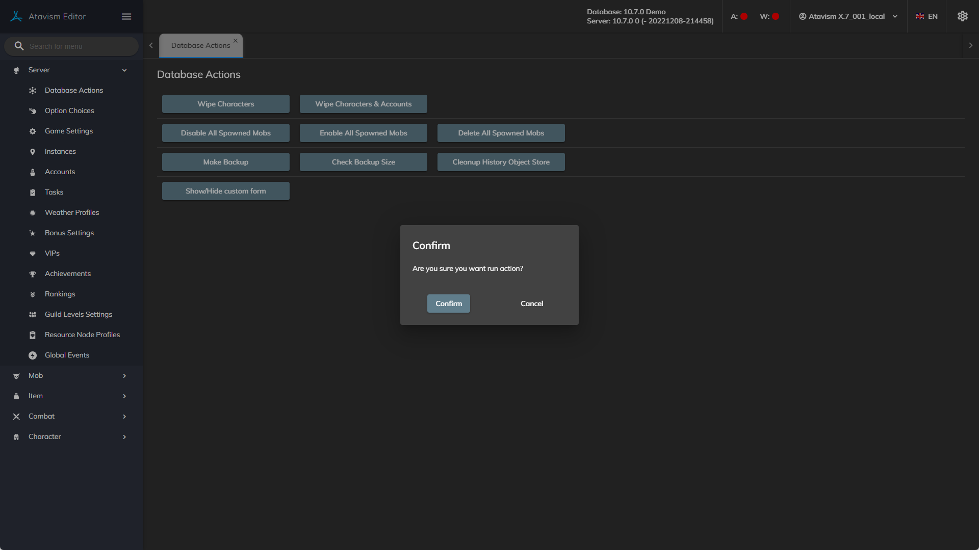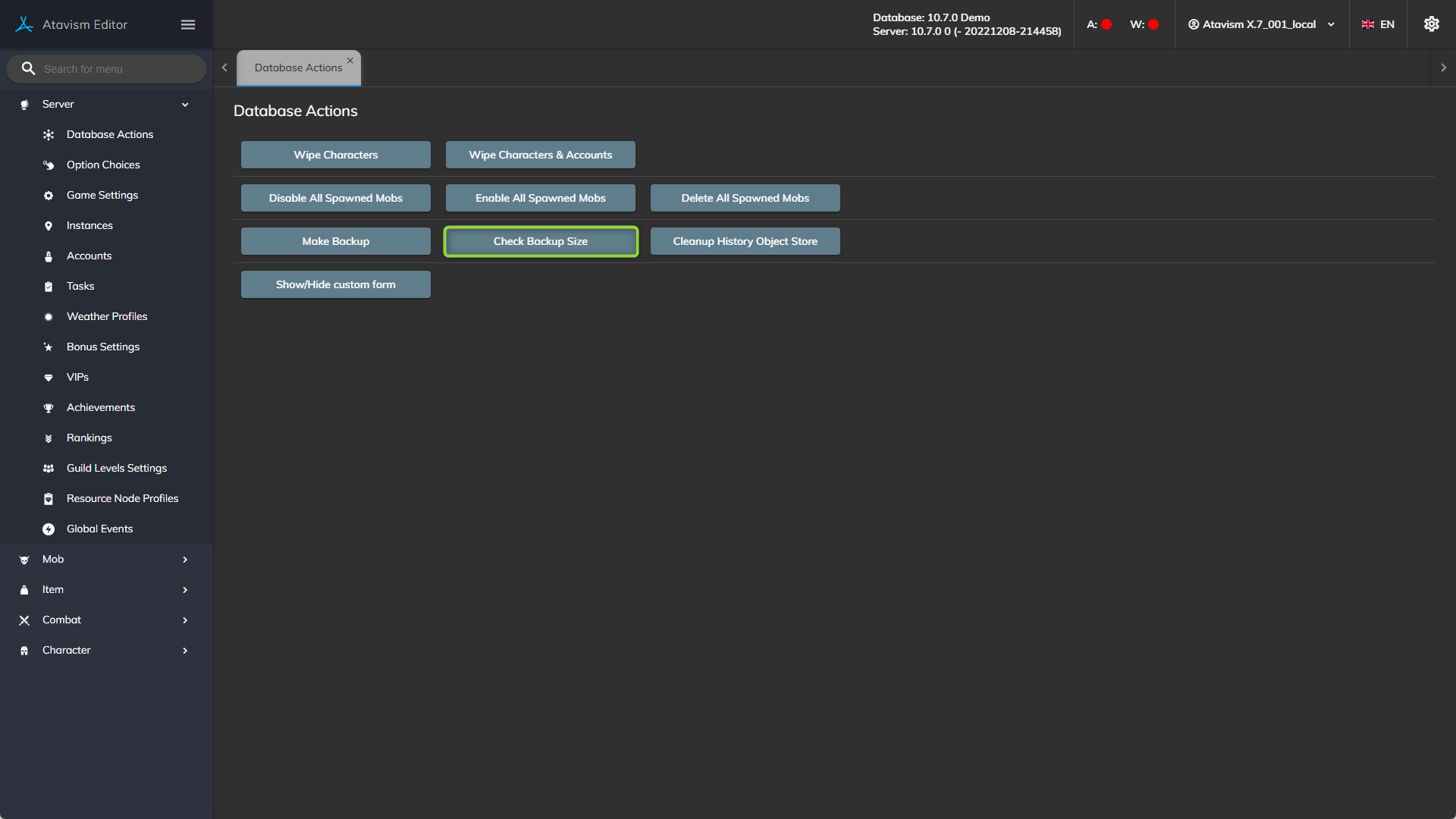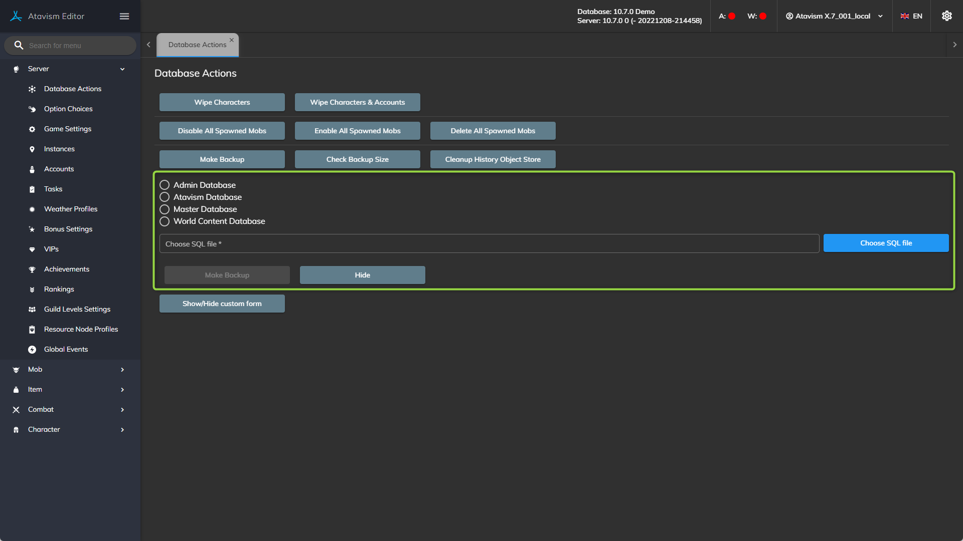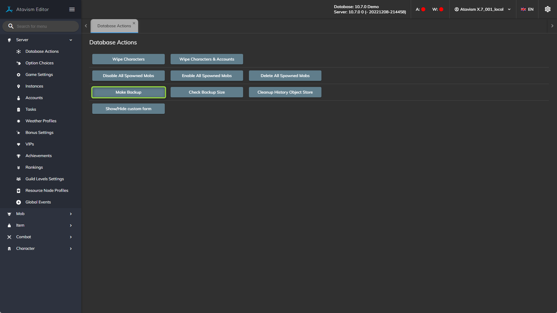 The atavism database stores all important information and configuration, along with your Unity project files it is the most important part of your game. Sometimes, you will want to make a backup to just have a copy elsewhere just in case, or you will want to migrate your database to a new server. In such cases, you can use any third-party tools like MySQL Workbench, HeidSQL, or even the command line, or you can use the built-in feature in the Atavism Standalone Editor.
