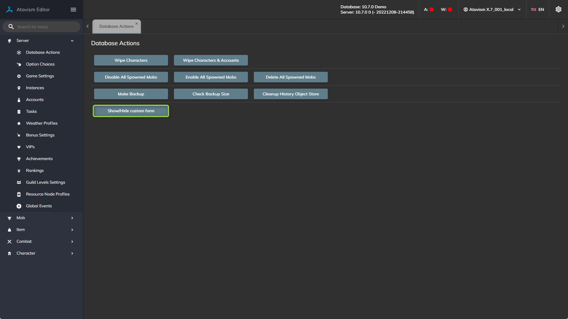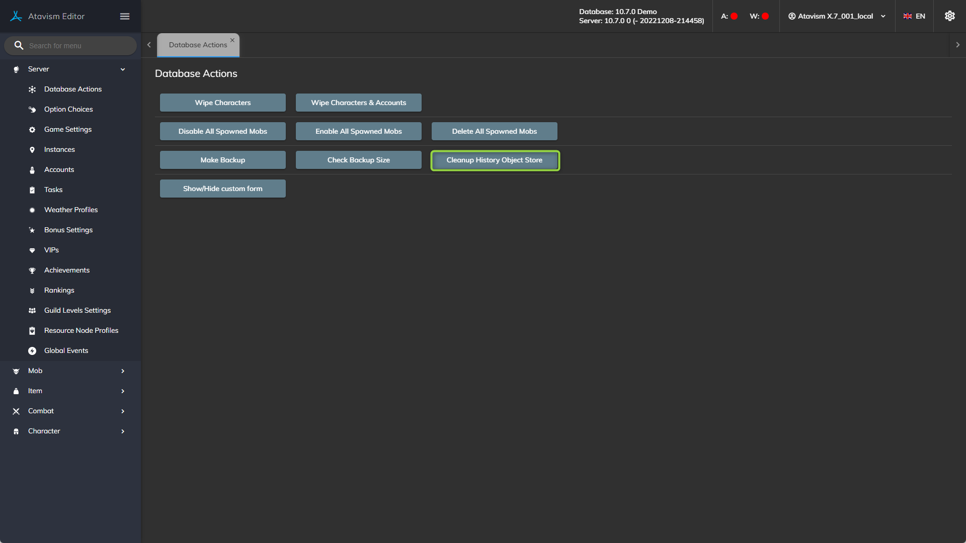 In the Ataivsm Editor, open Database Actions from the menu where are 4 options that we will cover in this document: