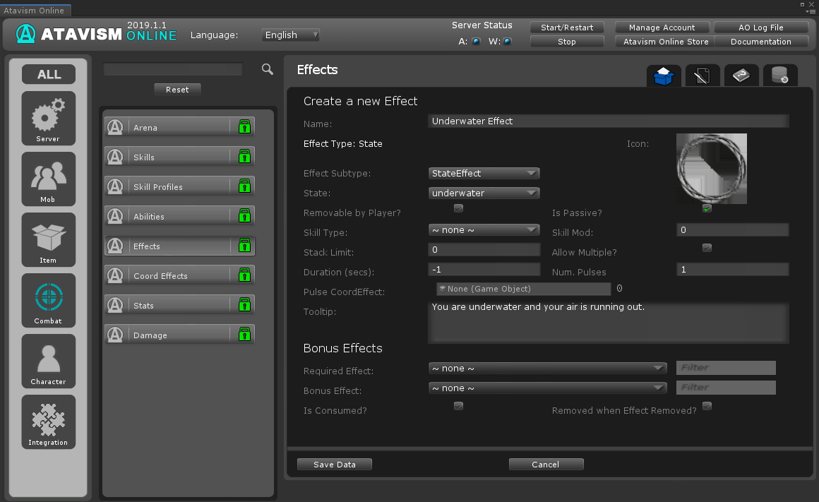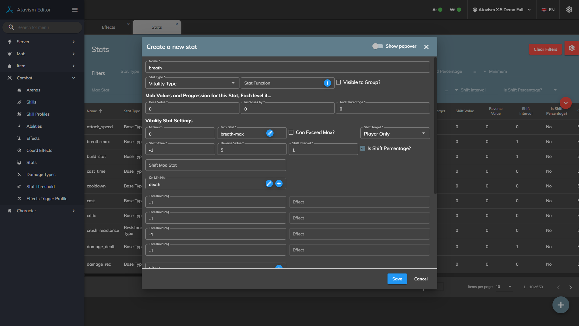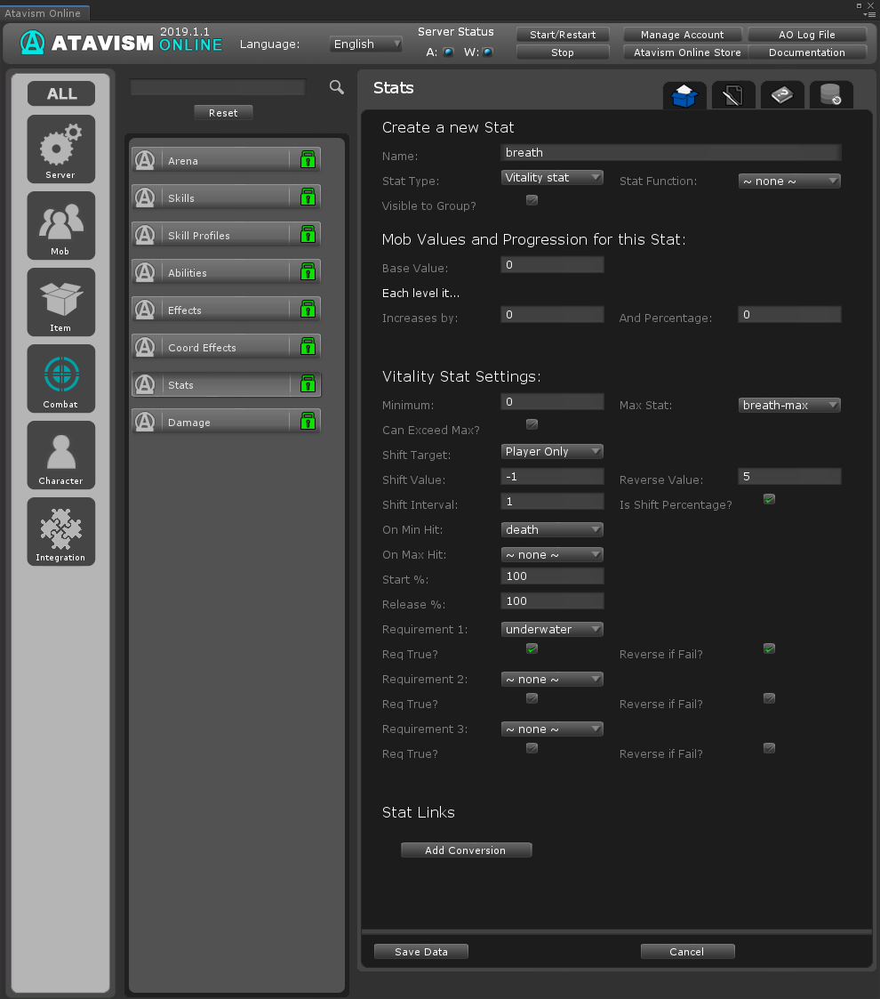 - Configure the breath and breath-max statistics in the player character template plugin in the Atavism Standalone Editor, set it to 100, save and restart the Atavism world server.