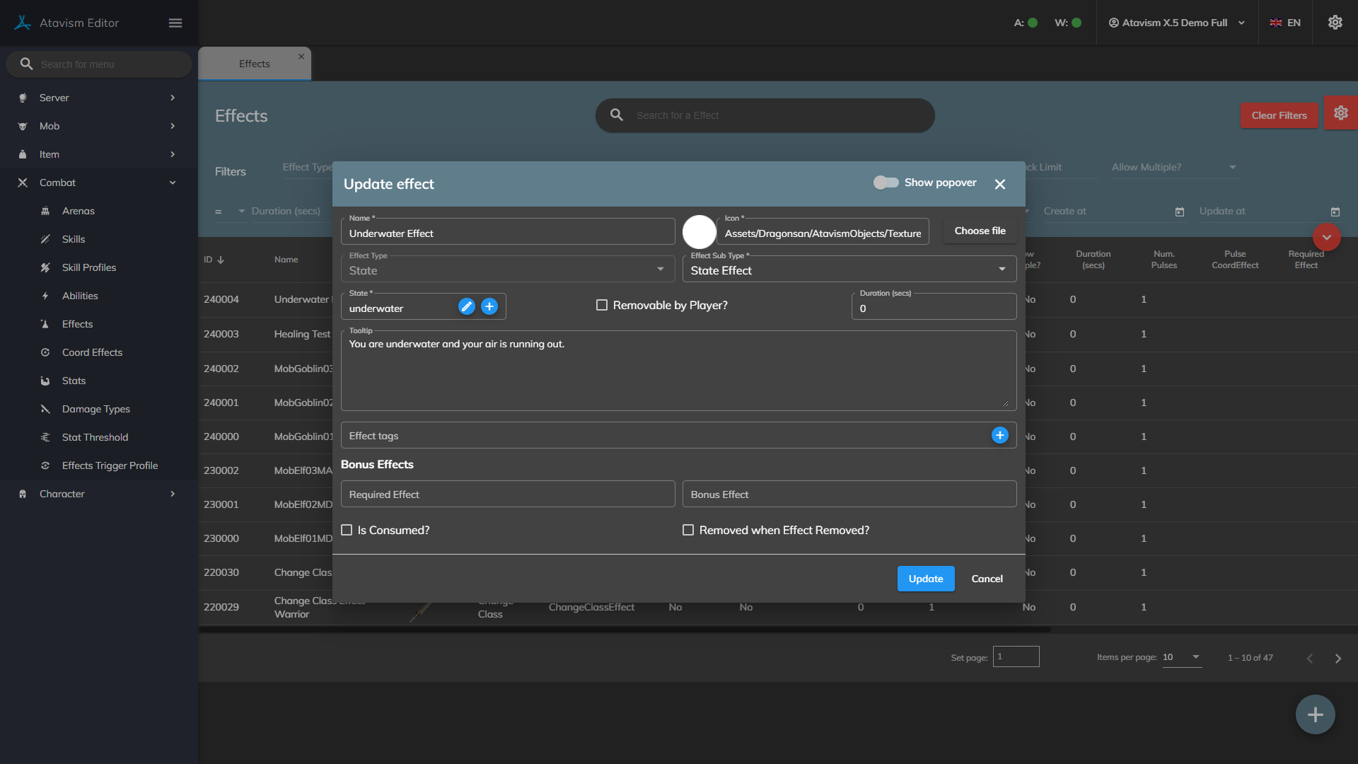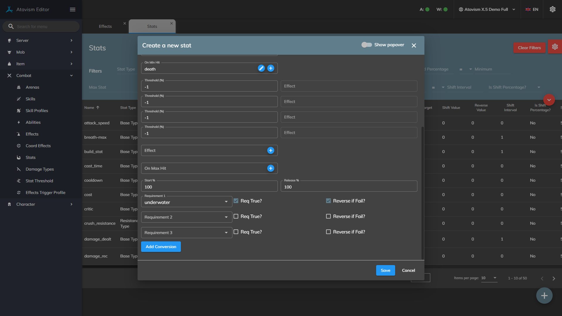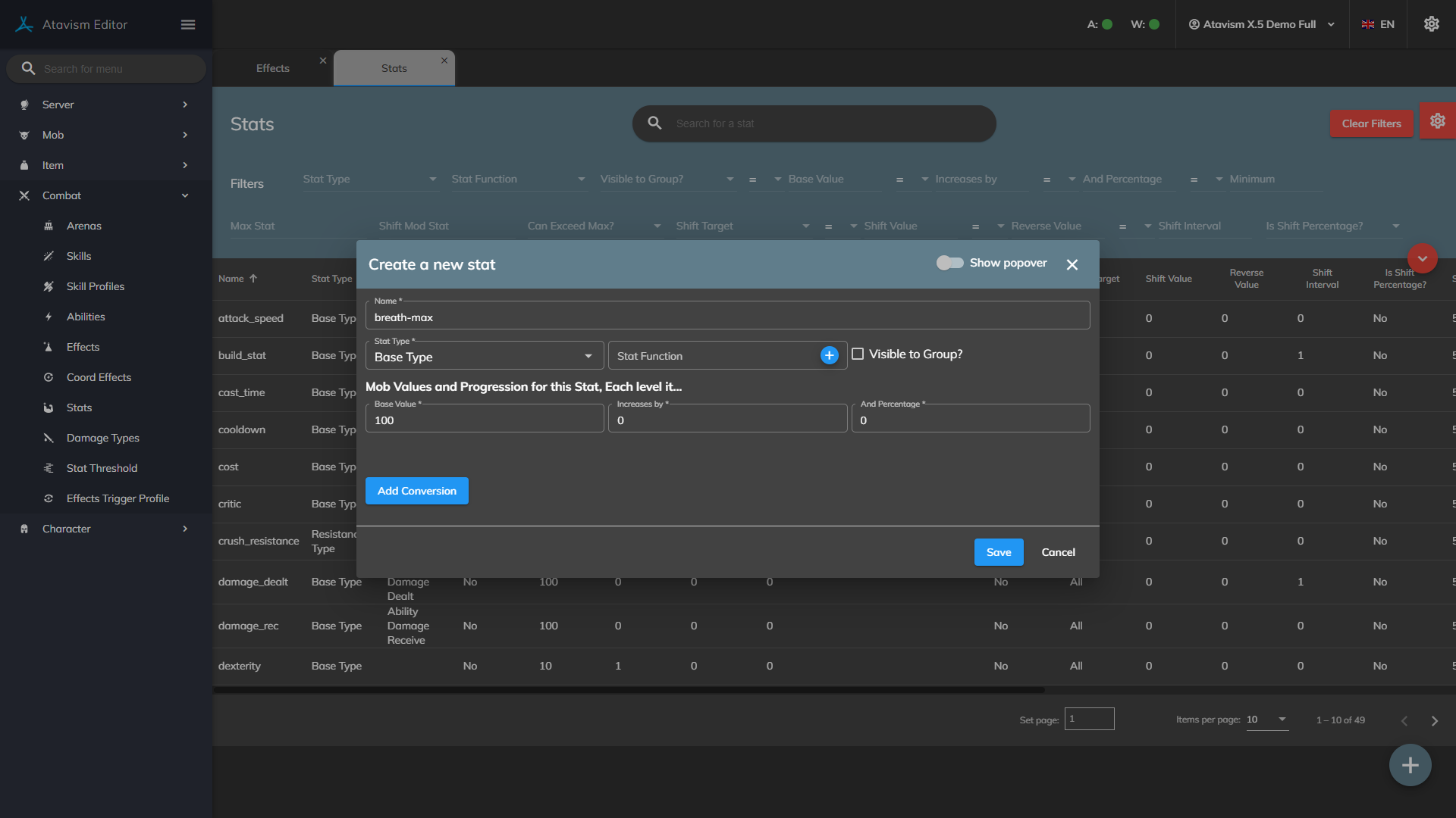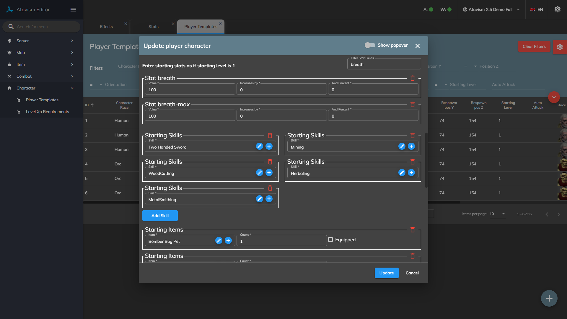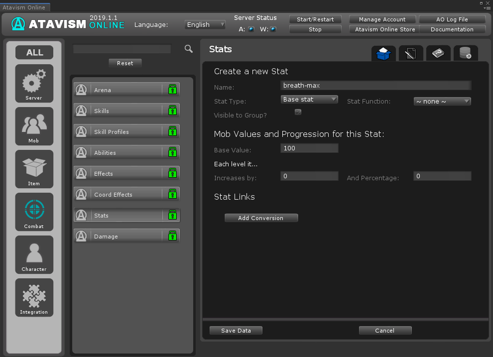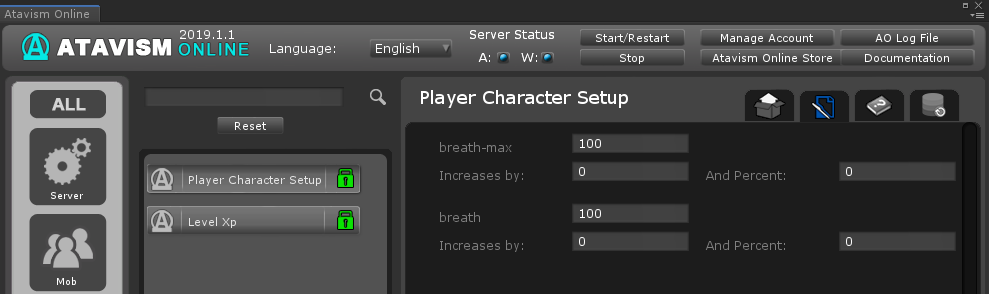 - Configure the breath and breath-max statistics in the player character template plugin in the Atavism Editor, set it to 100, save and restart the Atavism world server.