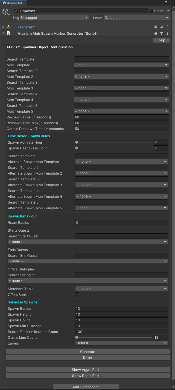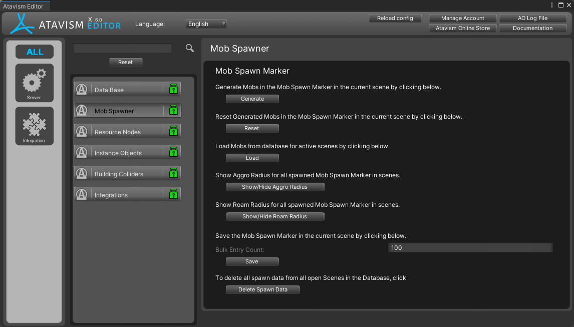 Reset: Resets all spawns for all Atavism Generators and remove all spawned mobs/NPCs from the scene. Keep in mind that it won’t remove them from the database.