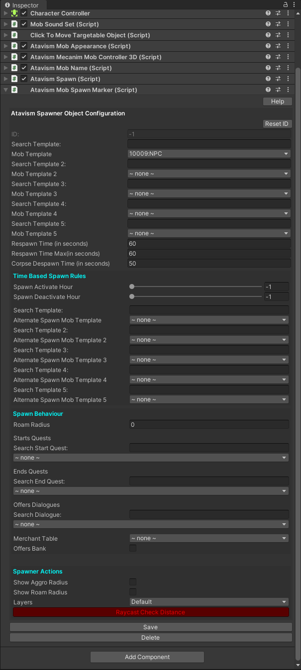 Mob Template (1-5): Defines Mob Templates that you are defining in the Atavism Standalone Editor, and Ataivsm will randomize one of them.