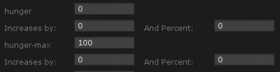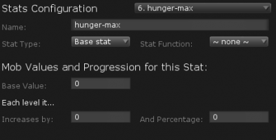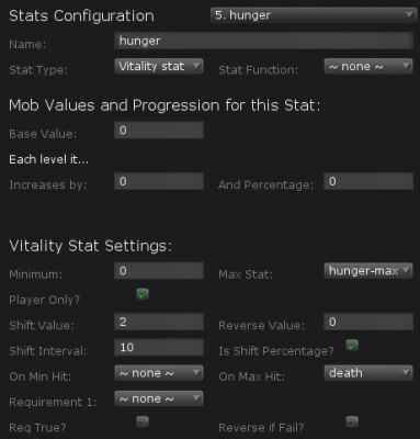 For example, a hunger stat can be set with a max of 100, and a min of 0. The stat can be set to increase by 2 every 6 seconds, with death occurring when hunger reaches 100. If the player doesn’t eat some food (or have some effect applied) that decreases their hunger, they will die in 300 seconds (5 minutes).