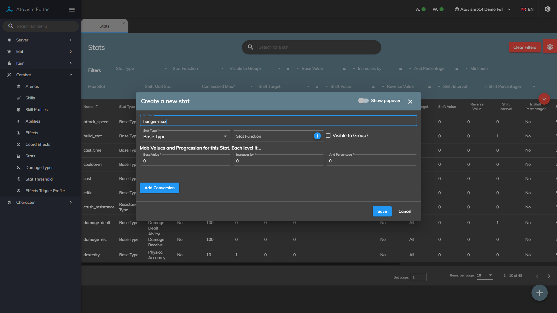 A max-stat needs to be set up to control the maximum value of the vitality stat. Open the Stat plugin in the Atavism Editor and create a new stat with the type Base Stat. I generally put the word “max” in the max-stat name to help identify it. Leave Stat Function as none and ignore the Mob Values.