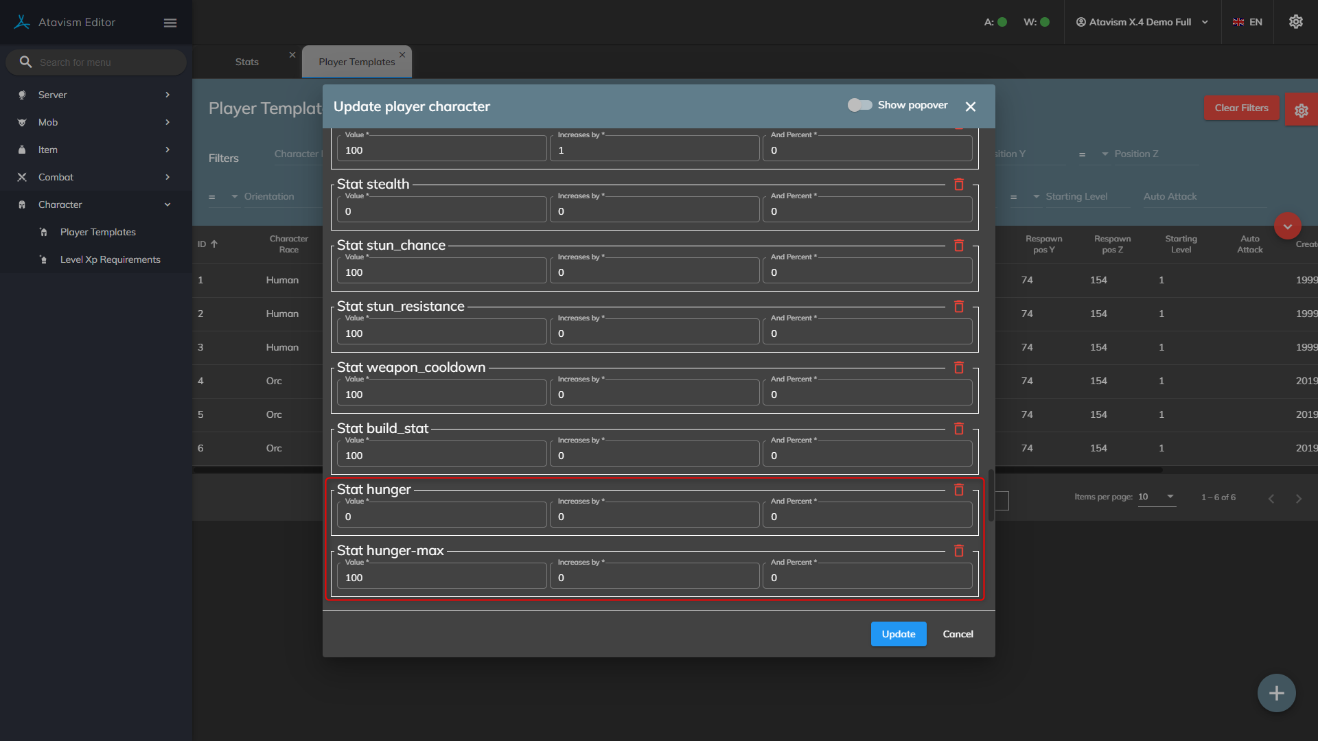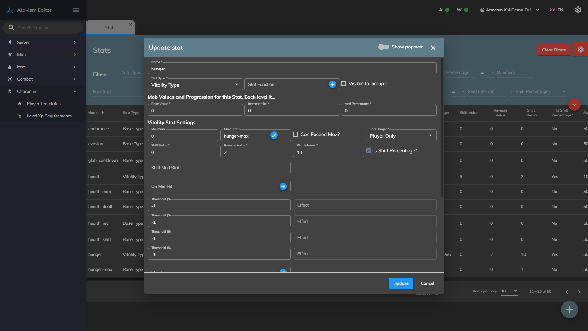 For all those who have wanted hunger, warmth, and other survival stats in their games, Atavism now provides the type of stat known as Vitality Stats. These stats allow a change in the value over time (known as a shift) with actions that can be set upon reaching the minimum or maximum value (such as the player/mob dying).