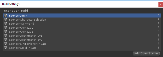 The Login, CharacterSelection, and MainWorld scenes need to be added to the build settings or you will have trouble entering the world. From Atavism 2018.1 more scenes presenting new features like Arenas or private instances were included in the project, so here is a screen presenting scenes you should put into the build window.