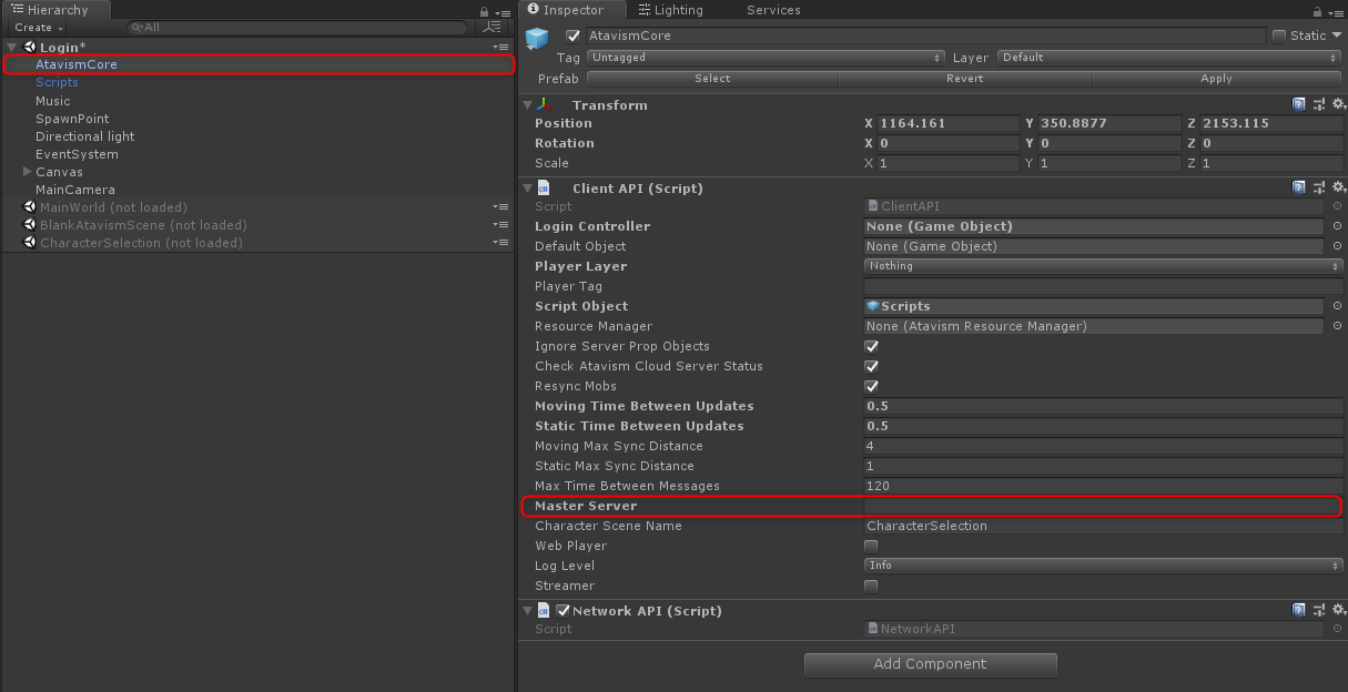 – In login scene -> Atavism Core -> enter details for master server.