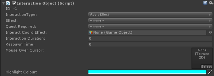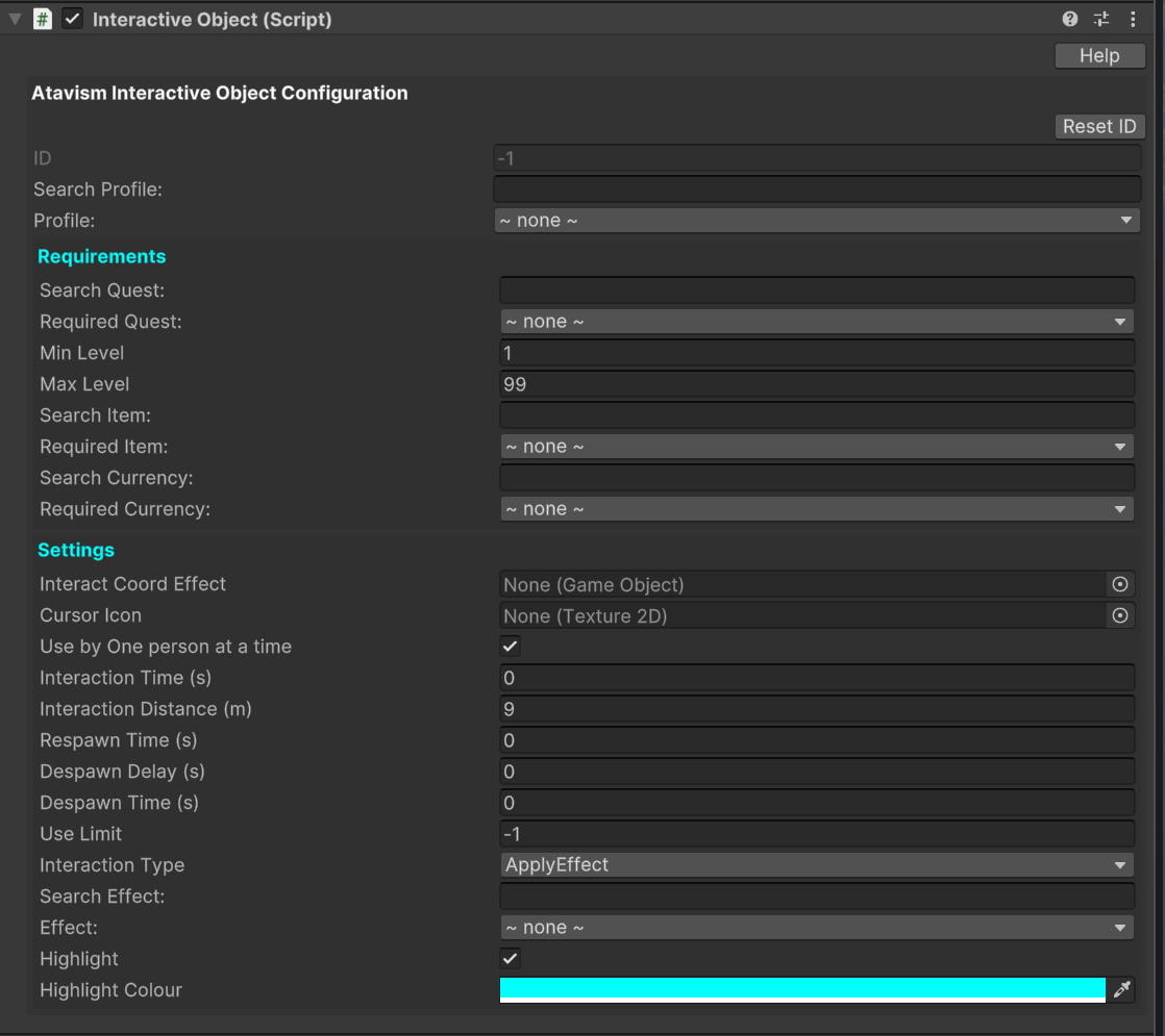 Interactive Object Profile: Let you select a profile if you want to use the same settings on many in-scene objects on dynamic objects, then this is the best way to do this. More information on how to create such a profile in the Atavism Standalone Editor can be found here.