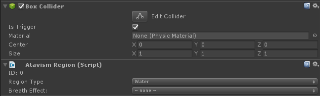 Regions are GameObjects with colliders that exist in a Unity Scene. Place your Game Object in the scene and add an Atavism Region component. The important thing is to not scale objects but collider only like cube directly on Box Collider Component. Also Collider Component has to have Is Trigger checkbox ticked.