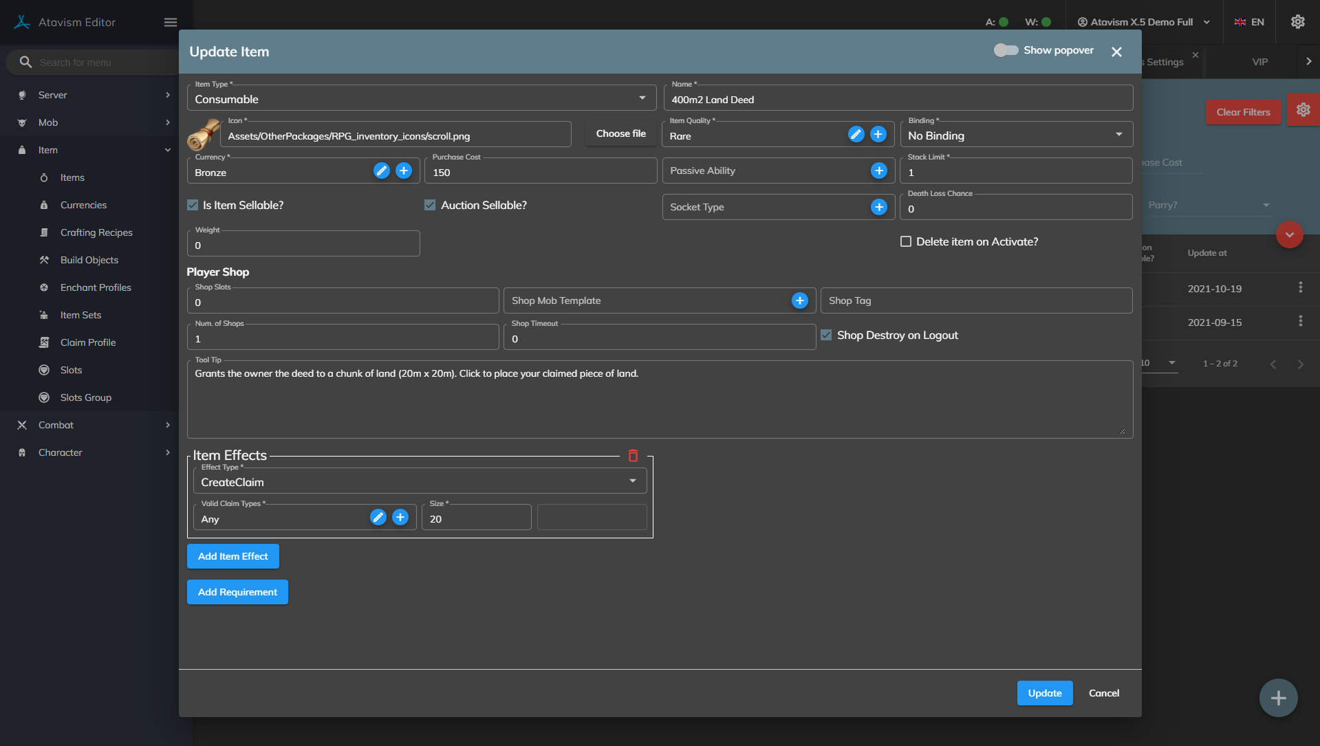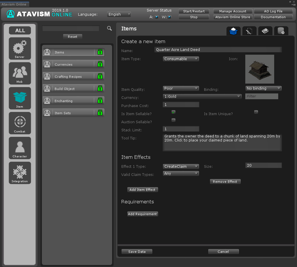 - Items with a ‘CreateClaim‘ effect can be used. Make sure the size field is filled in. It is in meters.
