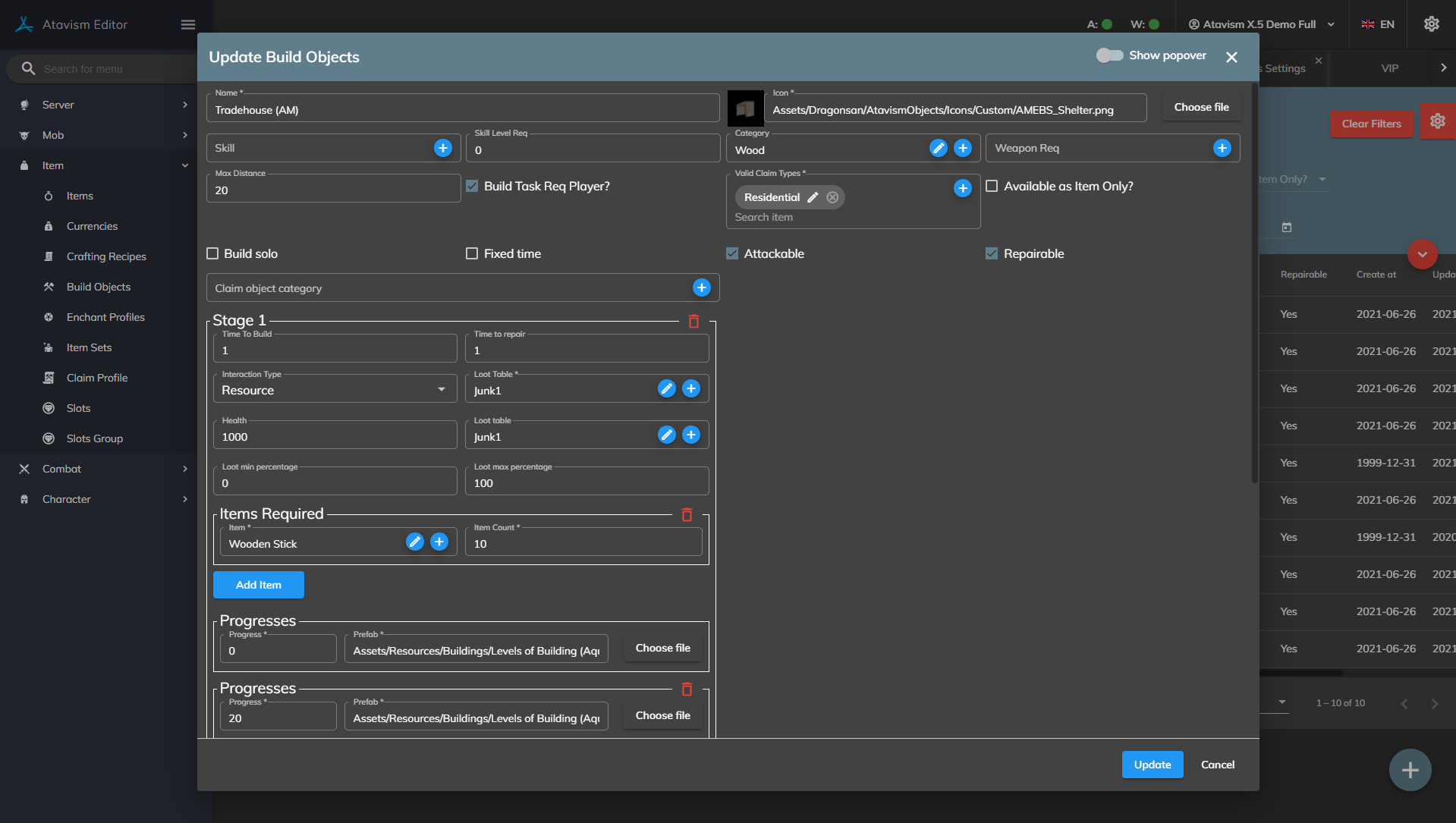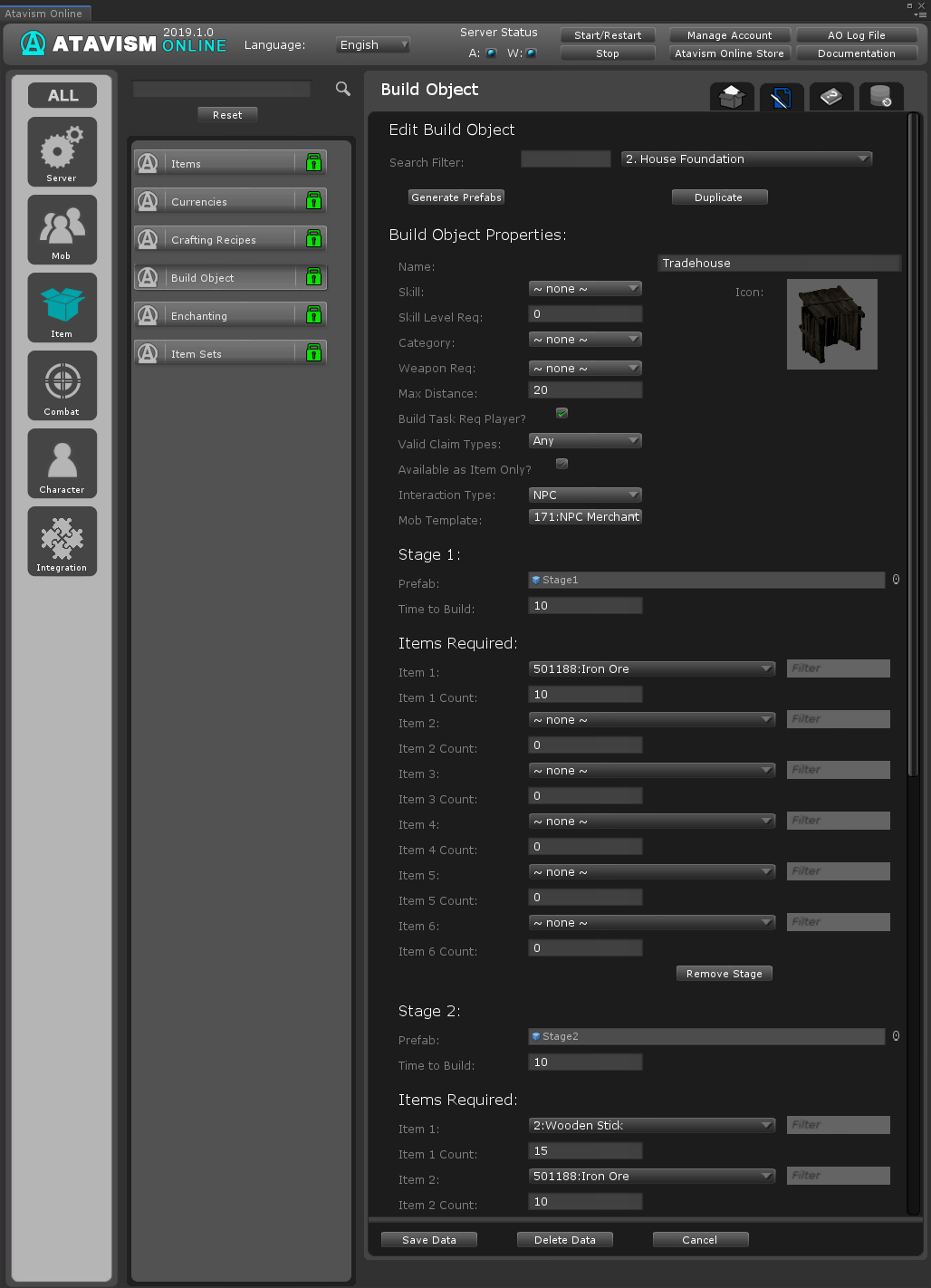 Once the prefab has been made, go into the Build Object Plugin in the Atavism Editor and create a new template. Set the name and other requirements as needed, then drag the prefab into the Stage 1 Prefab slot along with setting the Items needed to be able to build this object.