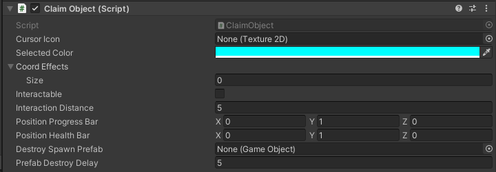 Before a user can have an object to place in the world a prefab needs to be created in Unity. The Prefab will need the ClaimObject component added to it along with a collider either on the object or one of its children so it can detect mouse over and clicks.