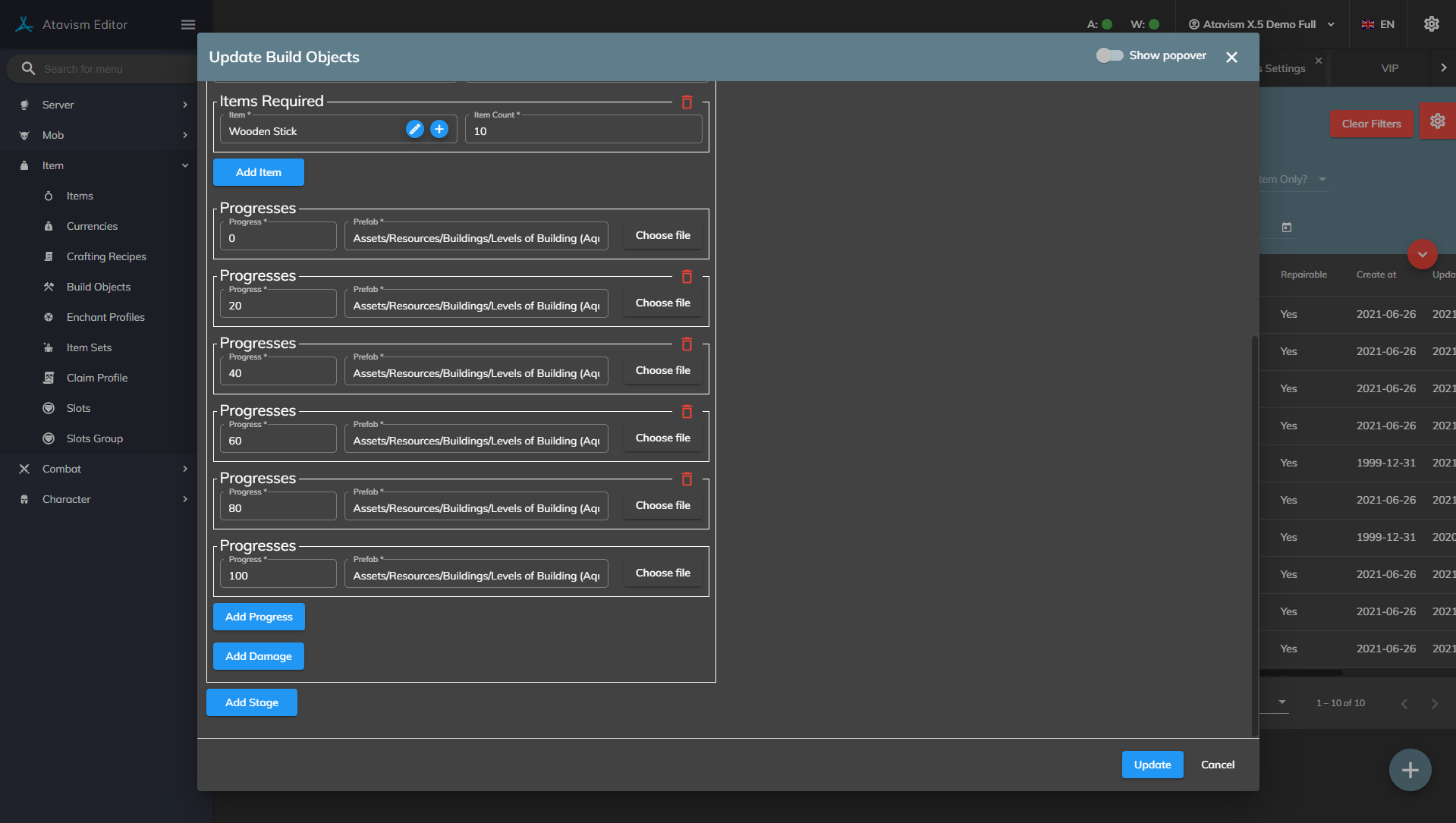 If you want additional stages to your build object (allowing players to build up their object) then click the Add stage and set the new prefab for each stage.
