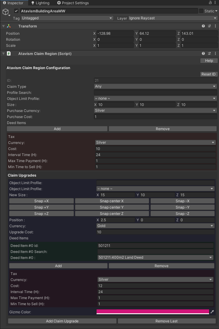 Claims can be upgraded and provide more buildings that can be built in it, increase upkeep cost, but also increase its size to let players have more land. In this example entry size is 10x10x10 meter, the purchase cost of this claim is 1 silver, and it’s a claim type of Any type, so there can be built any kind of buildings from any category. Tax for the first level of this claim is 10 silver that will extend the time for 24 hours, it can be paid manually 1 hour before the tax period will be over, and it can be sold when the tax time is higher than 1 hour.
